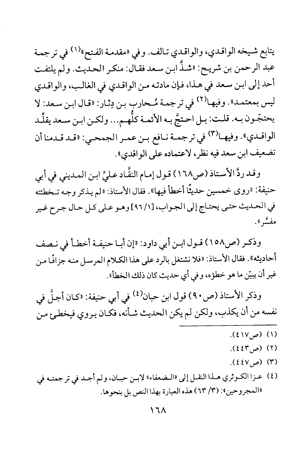 وقد ردَّ الأستاذ (ص ١٦٨) قول إمام النقَّاد عليِّ ابن المديني في أبي حنيفة: «روى خمسين حديثًا أخطأ فيها». فقال الأستاذ: «لم يذكر وجه تخطئته في الحديث حتى يحتاج إلى الجواب، [١/ ٩٦] وهو على كل حال جرح غير مفسَّر».