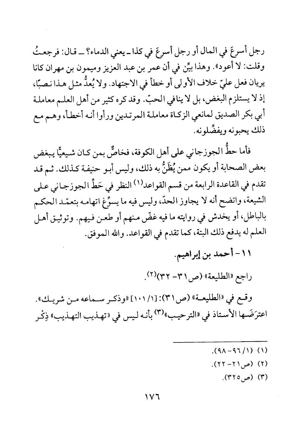 فأما حطُّ الجوزجاني على أهل الكوفة، فخاصٌّ بمن كان شيعيًّا يبغض بعض الصحابة أو يكون ممن يُظَنُّ به ذلك، وليس أبو حنيفة كذلك. ثم قد تقدم في القاعدة الرابعة من قسم القواعد (¬١) النظر في حَطِّ الجوزجاني على الشيعة، واتضح أنه لا يجاوز الحدّ، وليس فيه ما يسوِّغ اتهامه بتعمّد الحكم بالباطل، أو يخدش في روايته ما فيه غضّ منهم أو طعن فيهم. وتوثيق أهل العلم له يدفع ذلك البتة، كما تقدم في القواعد. والله الموفق.