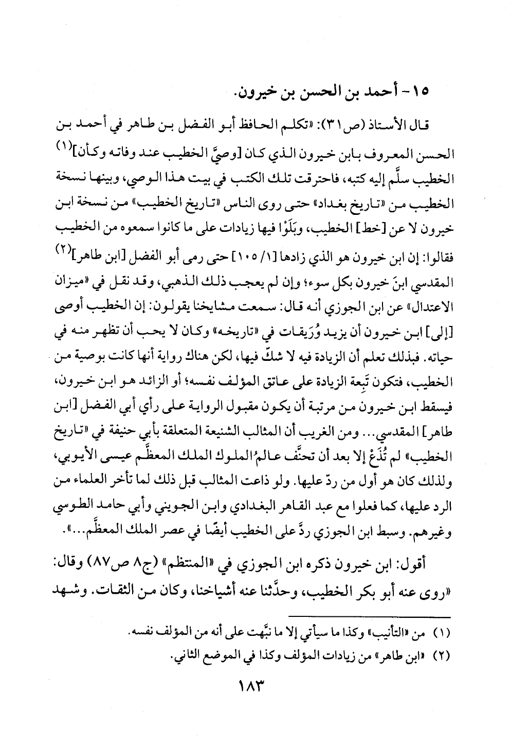 أقول: ابن خيرون ذكره ابن الجوزي في «المنتظم» (ج ٨ ص ٨٧) وقال: «روى عنه أبو بكر الخطيب، وحدَّثنا عنه أشياخنا، وكان من الثقات. وشهد