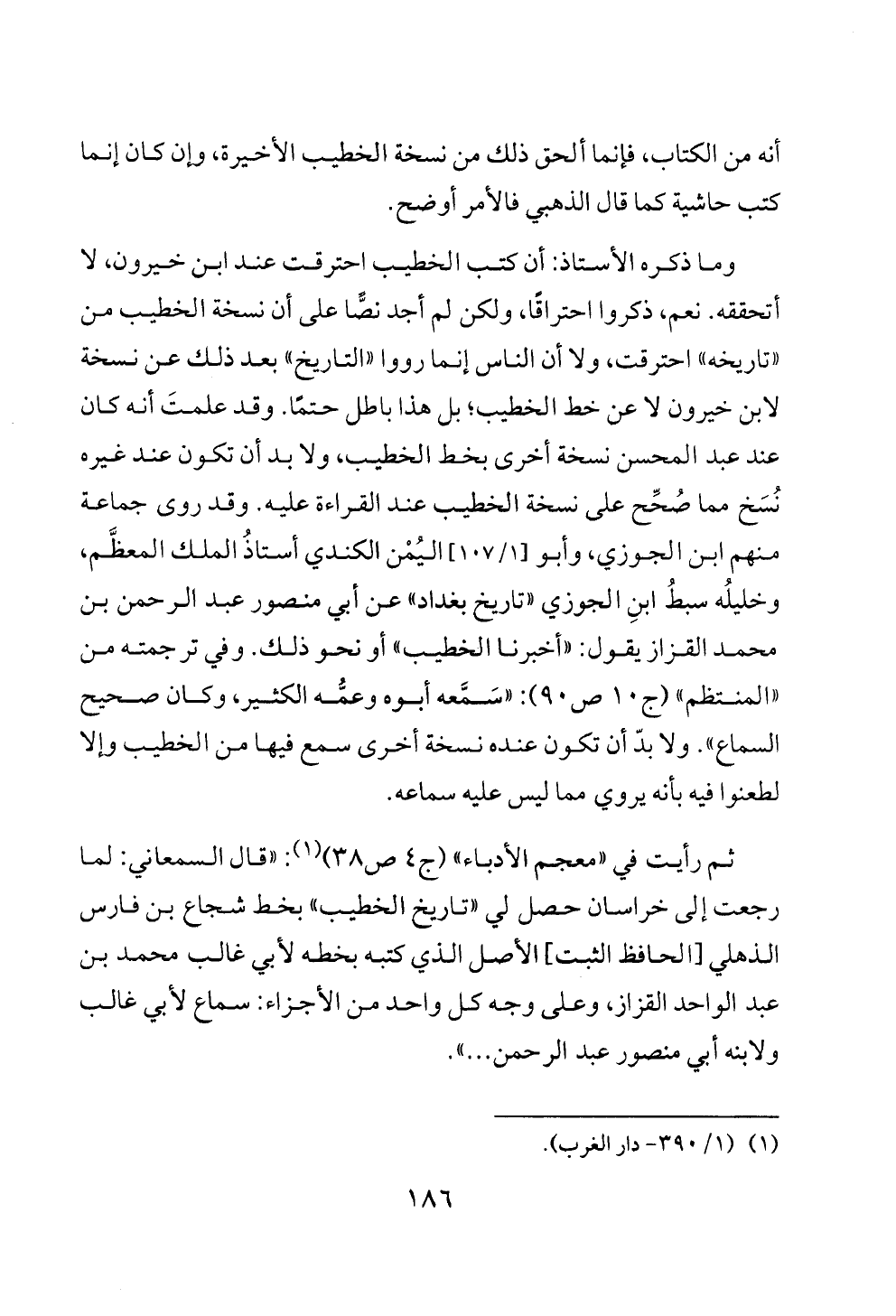 وما ذكره الأستاذ: أن كتب الخطيب احترقت عند ابن خيرون، لا أتحققه. نعم، ذكروا احتراقًا، ولكن لم أجد نصًّا على أن نسخة الخطيب من «تاريخه» احترقت، ولا أن الناس إنما رووا «التاريخ» بعد ذلك عن نسخة لابن خيرون لا عن خط الخطيب؛ بل هذا باطل حتمًا. وقد علمتَ أنه كان عند عبد المحسن نسخة أخرى بخط الخطيب، ولا بد أن تكون عند غيره نُسَخ مما صُحِّح على نسخة الخطيب عند القراءة عليه. وقد روى جماعة منهم ابن الجوزي، وأبو [١/ ١٠٧] اليُمْن الكندي أستاذُ الملك المعظَّم، وخليلُه سبطُ ابنِ الجوزي «تاريخ بغداد» عن أبي منصور عبد الرحمن بن محمد القزاز يقول: «أخبرنا الخطيب» أو نحو ذلك. وفي ترجمته من «المنتظم» (ج ١٠ ص ٩٠): «سَمَّعه أبوه وعمُّه الكثير، وكان صحيح السماع». ولا بدّ أن تكون عنده نسخة أخرى سمع فيها من الخطيب وإلا لطعنوا فيه بأنه يروي مما ليس عليه سماعه.