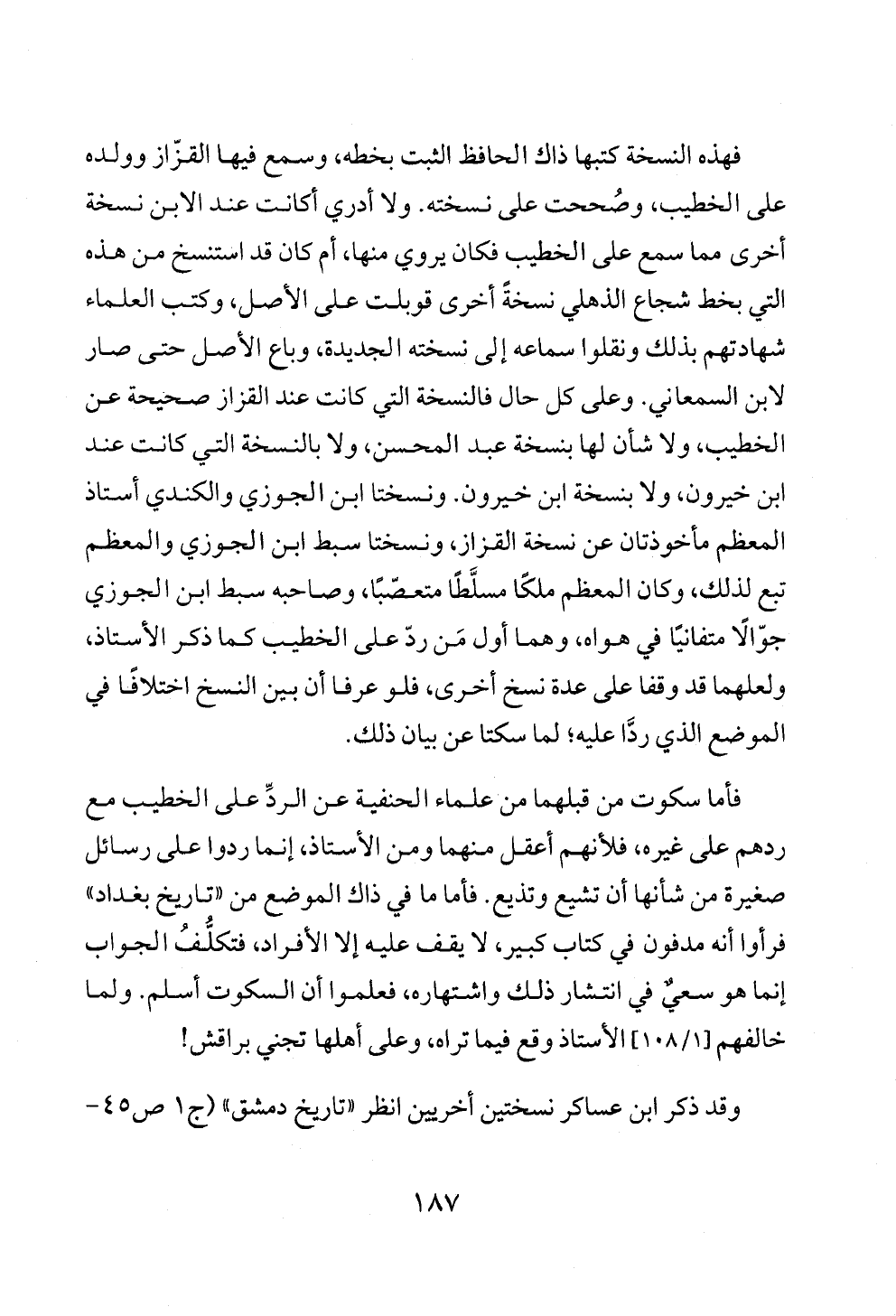 فهذه النسخة كتبها ذاك الحافظ الثبت بخطه، وسمع فيها القزّاز وولده على الخطيب، وصُححت على نسخته. ولا أدري أكانت عند الابن نسخة أخرى مما سمع على الخطيب فكان يروي منها، أم كان قد استنسخ من هذه التي بخط شجاع الذهلي نسخةً أخرى قوبلت على الأصل، وكتب العلماء شهادتهم بذلك ونقلوا سماعه إلى نسخته الجديدة، وباع الأصل حتى صار لابن السمعاني. وعلى كل حال فالنسخة التي كانت عند القزاز صحيحة عن الخطيب، ولا شأن لها بنسخة عبد المحسن، ولا بالنسخة التي كانت عند ابن خيرون، ولا بنسخة ابن خيرون. ونسختا ابن الجوزي والكندي أستاذ المعظم مأخوذتان عن نسخة القزاز، ونسختا سبط ابن الجوزي والمعظم تبع لذلك، وكان المعظم ملكًا مسلَّطًا متعصّبًا، وصاحبه سبط ابن الجوزي جوّالًا متفانيًا في هواه، وهما أول مَن ردّ على الخطيب كما ذكر الأستاذ، ولعلهما قد وقفا على عدة نسخ أخرى، فلو عرفا أن بين النسخ اختلافًا في الموضع الذي ردَّا عليه؛ لما سكتا عن بيان ذلك.