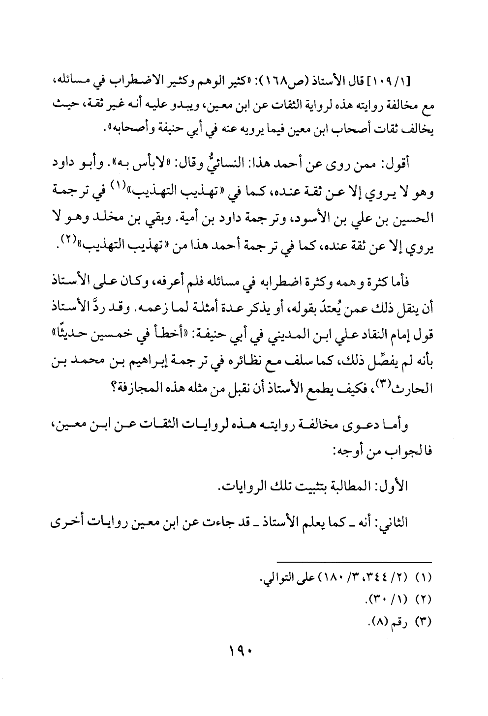 فأما كثرة وهمه وكثرة اضطرابه في مسائله فلم أعرفه، وكان على الأستاذ أن ينقل ذلك عمن يُعتدّ بقوله، أو يذكر عدة أمثلة لما زعمه. وقد ردَّ الأستاذ قول إمام النقاد علي ابن المديني في أبي حنيفة: «أخطأ في خمسين حديثًا» بأنه لم يفصِّل ذلك، كما سلف مع نظائره في ترجمة إبراهيم بن محمد بن الحارث (¬٣)، فكيف يطمع الأستاذ أن نقبل من مثله هذه المجازفة؟