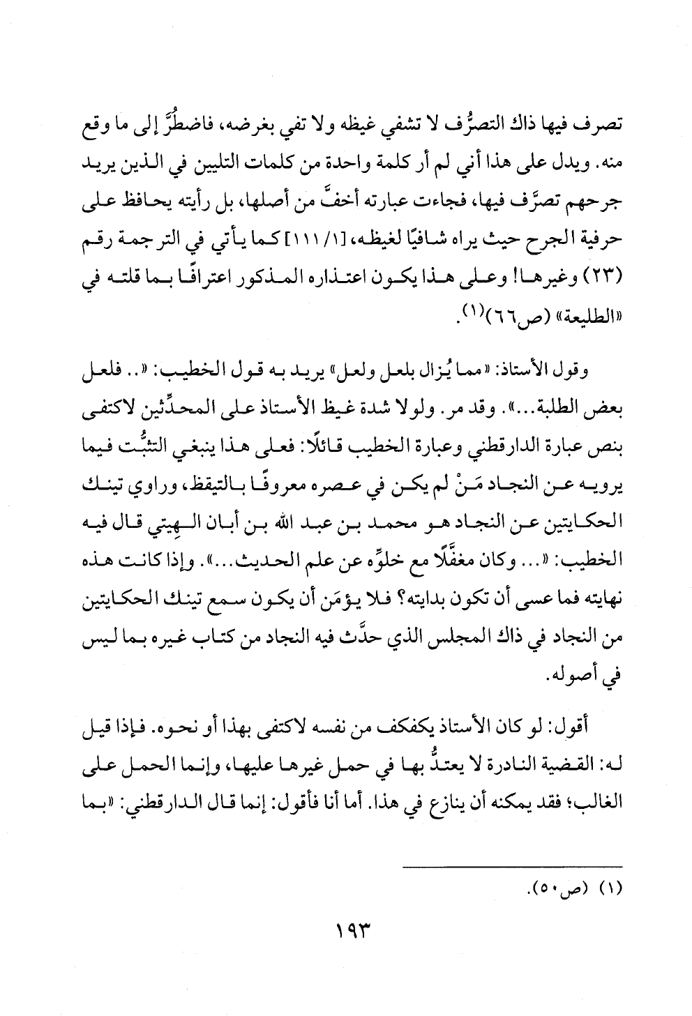 وقول الأستاذ: «مما يُزال بلعل ولعل» يريد به قول الخطيب: « .. فلعل بعض الطلبة ... ». وقد مر. ولولا شدة غيظ الأستاذ على المحدِّثين لاكتفى بنص عبارة الدارقطني وعبارة الخطيب قائلًا: فعلى هذا ينبغي التثبُّت فيما يرويه عن النجاد مَنْ لم يكن في عصره معروفًا بالتيقظ، وراوي تينك الحكايتين عن النجاد هو محمد بن عبد الله بن أبان الهِيتي قال فيه الخطيب: « ... وكان مغفَّلًا مع خلوِّه عن علم الحديث ... ». وإذا كانت هذه نهايته فما عسى أن تكون بدايته؟ فلا يؤمَن أن يكون سمع تينك الحكايتين من النجاد في ذاك المجلس الذي حدَّث فيه النجاد من كتاب غيره بما ليس في أصوله.