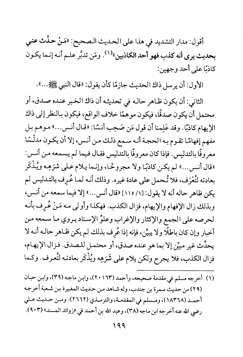 الثاني: أن يكون ظاهر حاله في تحديثه أن ذاك الخبر عنده صدق، أو محتمل أن يكون صدقًا، فيكون موهمًا خلاف الواقع، فيكون بالنظر إلى ذاك الإيهام كاذبًا. وقد عَلِمنا أن قول مَن صَحِب أنسًا: «قال أنس ... » موهم بل مفهم إفهامًا تقوم به الحجة أنه سمع ذلك من أنس، إلا أن يكون مدلّسًا معروفًا بالتدليس. فإذا كان معروفًا بالتدليس فقال فيما لم يسمعه من أنس: «قال أنس ... » لم يكن كاذبًا ولا مجروحًا، وإنما يلام على شرَهِه ويُذْكَر بعادته لتُعْرَف، فلا تُحمل على عادة غيره. وذلك أنه لما عُرِف بالتدليس لم يكن ظاهر حاله أنه لا يقول: [١/ ١١٥] «قال أنس ... » إلا فيما سمعه من أنس، وبذلك زال الإفهام والإيهام، فزال الكذب. فهكذا وأولى منه مَنْ عُرِف بأنه لحرصه على الجمع والإكثار والإغراب وعلوِّ الإسناد يروي ما سمعه من أخبار وإن كان باطلًا ولا يبيِّن، فإنه إذا عُرِف بذلك لم يكن ظاهر حاله أنه لا يحدِّث غير مبيِّن إلا بما هو عنده صدق، أو محتمل للصدق. فزال الإيهام، فزال الكذب، فلا يجرح ولكن يلام على شَرَهِه ويُذْكَر بعادته لتُعرف. وكما
