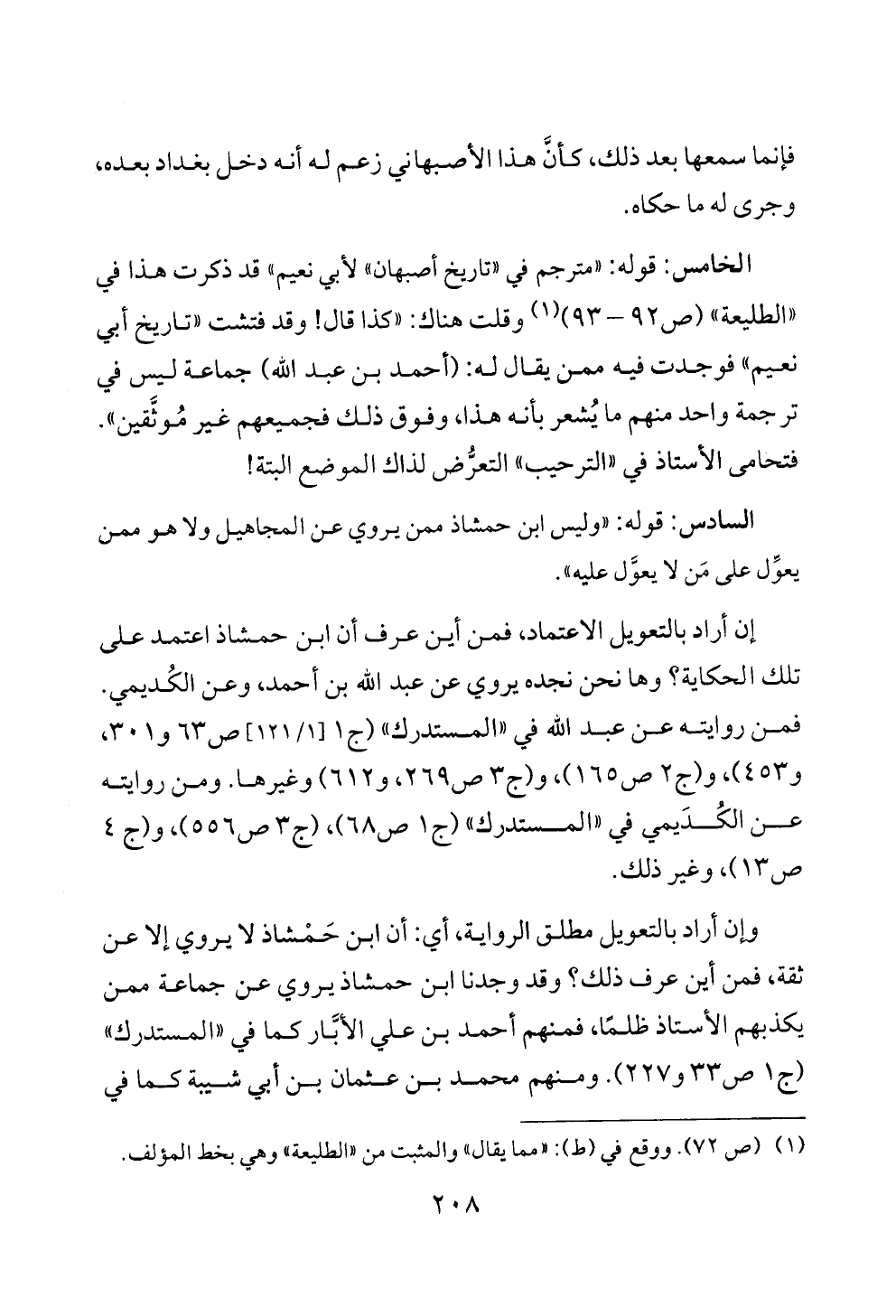 الخامس: قوله: «مترجم في «تاريخ أصبهان» لأبي نعيم» قد ذكرت هذا في «الطليعة» (ص ٩٢ - ٩٣) (¬١) وقلت هناك: «كذا قال! وقد فتشت «تاريخ أبي نعيم» فوجدت فيه ممن يقال له: (أحمد بن عبد الله) جماعة ليس في ترجمة واحد منهم ما يُشعر بأنه هذا، وفوق ذلك فجميعهم غير مُوثَّقين». فتحامى الأستاذ في «الترحيب» التعرُّض لذاك الموضع البتة!