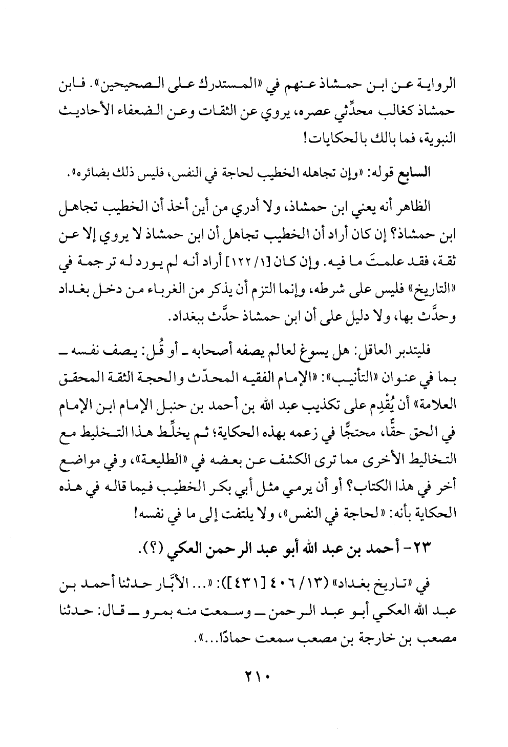 فليتدبر العاقل: هل يسوغ لعالم يصفه أصحابه ــ أو قُل: يصف نفسه ــ بما في عنوان «التأنيب»: «الإمام الفقيه المحدّث والحجة الثقة المحقق العلامة» أن يُقْدِم على تكذيب عبد الله بن أحمد بن حنبل الإمام ابن الإمام في الحق حقًّا، محتجًّا في زعمه بهذه الحكاية؛ ثم يخلِّط هذا التخليط مع التخاليط الأخرى مما ترى الكشف عن بعضه في «الطليعة»، وفي مواضع أخر في هذا الكتاب؟ أو أن يرمي مثل أبي بكر الخطيب فيما قاله في هذه الحكاية بأنه: «لحاجة في النفس»، ولا يلتفت إلى ما في نفسه!
