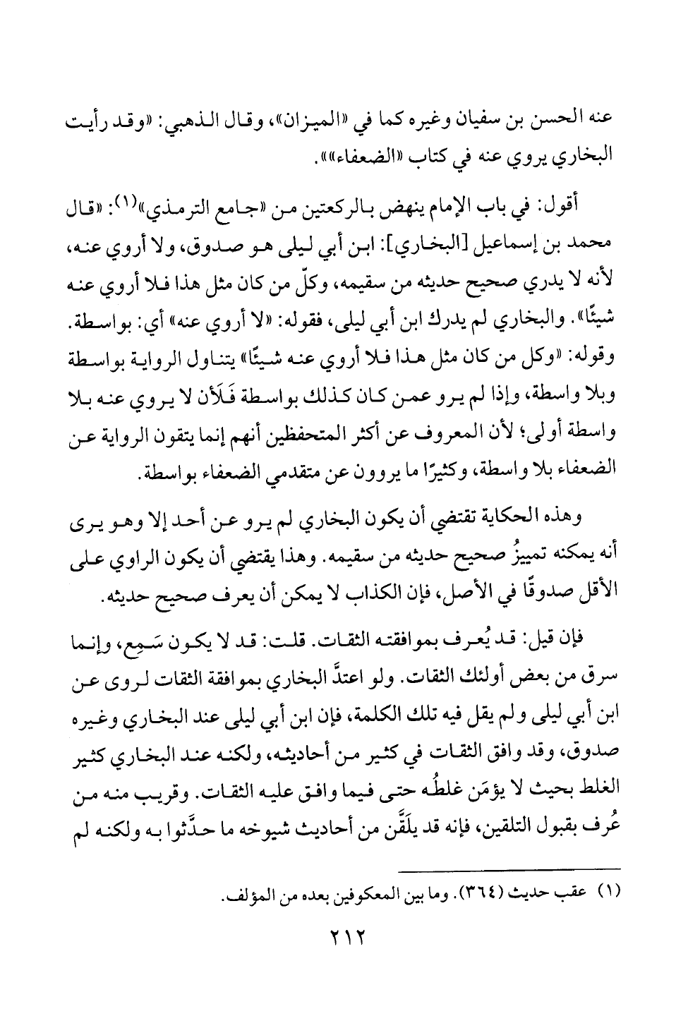 أقول: في باب الإمام ينهض بالركعتين من «جامع الترمذي» (¬١): «قال محمد بن إسماعيل [البخاري]: ابن أبي ليلى هو صدوق، ولا أروي عنه، لأنه لا يدري صحيح حديثه من سقيمه، وكلّ من كان مثل هذا فلا أروي عنه شيئًا». والبخاري لم يدرك ابن أبي ليلى، فقوله: «لا أروي عنه» أي: بواسطة. وقوله: «وكل من كان مثل هذا فلا أروي عنه شيئًا» يتناول الرواية بواسطة وبلا واسطة، وإذا لم يرو عمن كان كذلك بواسطة فَلَأن لا يروي عنه بلا واسطة أولى؛ لأن المعروف عن أكثر المتحفظين أنهم إنما يتقون الرواية عن الضعفاء بلا واسطة، وكثيرًا ما يروون عن متقدمي الضعفاء بواسطة.