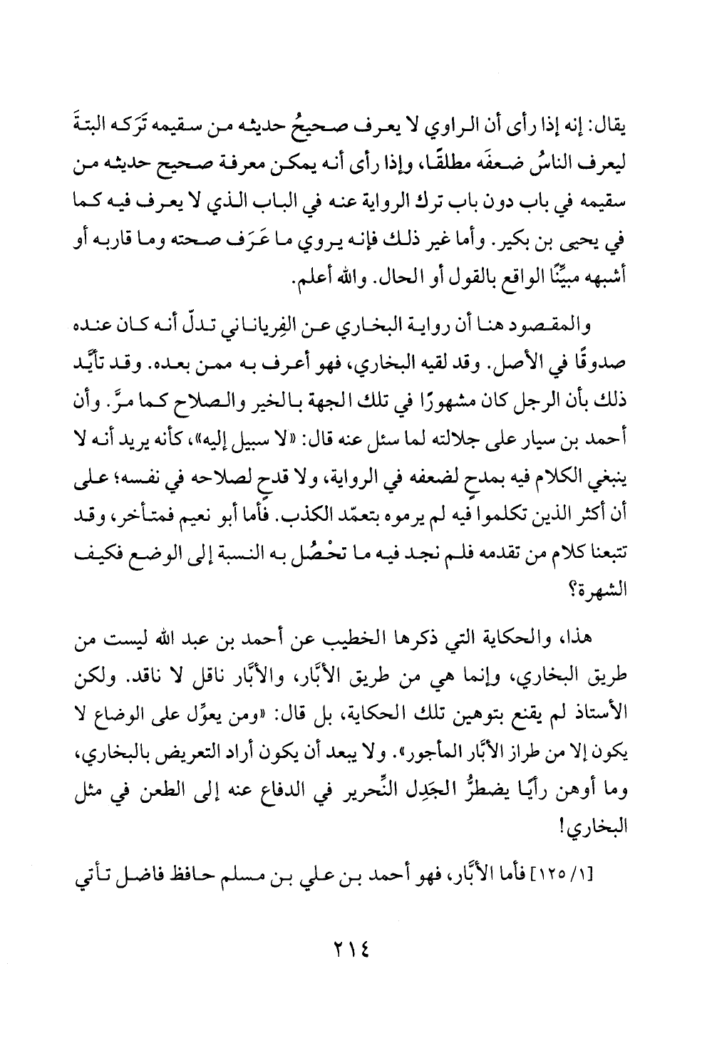 والمقصود هنا أن رواية البخاري عن الفِرياناني تدلّ أنه كان عنده صدوقًا في الأصل. وقد لقيه البخاري، فهو أعرف به ممن بعده. وقد تأيَّد ذلك بأن الرجل كان مشهورًا في تلك الجهة بالخير والصلاح كما مرَّ. وأن أحمد بن سيار على جلالته لما سئل عنه قال: «لا سبيل إليه»، كأنه يريد أنه لا ينبغي الكلام فيه بمدحٍ لضعفه في الرواية، ولا قدحٍ لصلاحه في نفسه؛ على أن أكثر الذين تكلموا فيه لم يرموه بتعمّد الكذب. فأما أبو نعيم فمتأخر، وقد تتبعنا كلام من تقدمه فلم نجد فيه ما تحْصُل به النسبة إلى الوضع فكيف الشهرة؟
