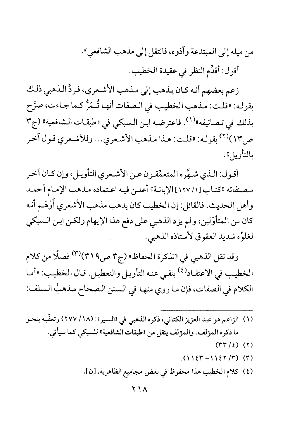 أقول: الذي شهَّره المتعمِّقون عن الأشعري التأويل، وإن كان آخر مصنفاته «كتاب [١/ ١٢٧] الإبانة» أعلن فيه اعتماده مذهب الإمام أحمد وأهل الحديث. فالقائل: إن الخطيب كان يذهب مذهب الأشعري أَوْهَم أنه كان من المتأوّلين، ولم يزد الذهبي على دفع هذا الإيهام ولكن ابن السبكي لغلوِّه شديد العقوق لأستاذه الذهبي.