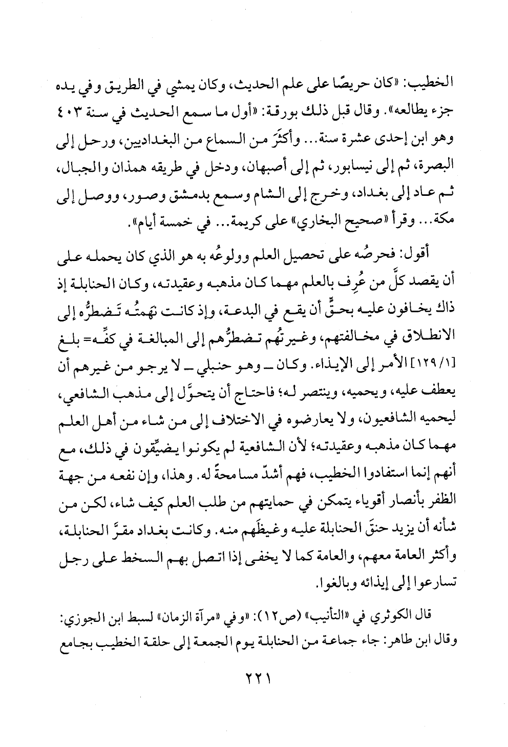 أقول: فحرصُه على تحصيل العلم وولوعُه به هو الذي كان يحمله على أن يقصد كلَّ من عُرِف بالعلم مهما كان مذهبه وعقيدته، وكان الحنابلة إذ ذاك يخافون عليه بحقٍّ أن يقع في البدعة، وإذ كانت نَهمتُه تَضطرُّه إلى الانطلاق في مخالفتهم، وغيرتُهم تضطرُّهم إلى المبالغة في كفِّه= بلغ [١/ ١٢٩] الأمر إلى الإيذاء. وكان ــ وهو حنبلي ــ لا يرجو من غيرهم أن يعطف عليه، ويحميه، وينتصر له؛ فاحتاج أن يتحوَّل إلى مذهب الشافعي، ليحميه الشافعيون، ولا يعارضوه في الاختلاف إلى من شاء من أهل العلم مهما كان مذهبه وعقيدته؛ لأن الشافعية لم يكونوا يضيِّقون في ذلك، مع أنهم إنما استفادوا الخطيب، فهم أشدّ مسامحةً له. وهذا، وإن نفعه من جهة الظفر بأنصار أقوياء يتمكن في حمايتهم من طلب العلم كيف شاء، لكن من شأنه أن يزيد حنقَ الحنابلة عليه وغيظَهم منه. وكانت بغداد مقرَّ الحنابلة، وأكثر العامة معهم، والعامة كما لا يخفى إذا اتصل بهم السخط على رجل تسارعوا إلى إيذائه وبالغوا.