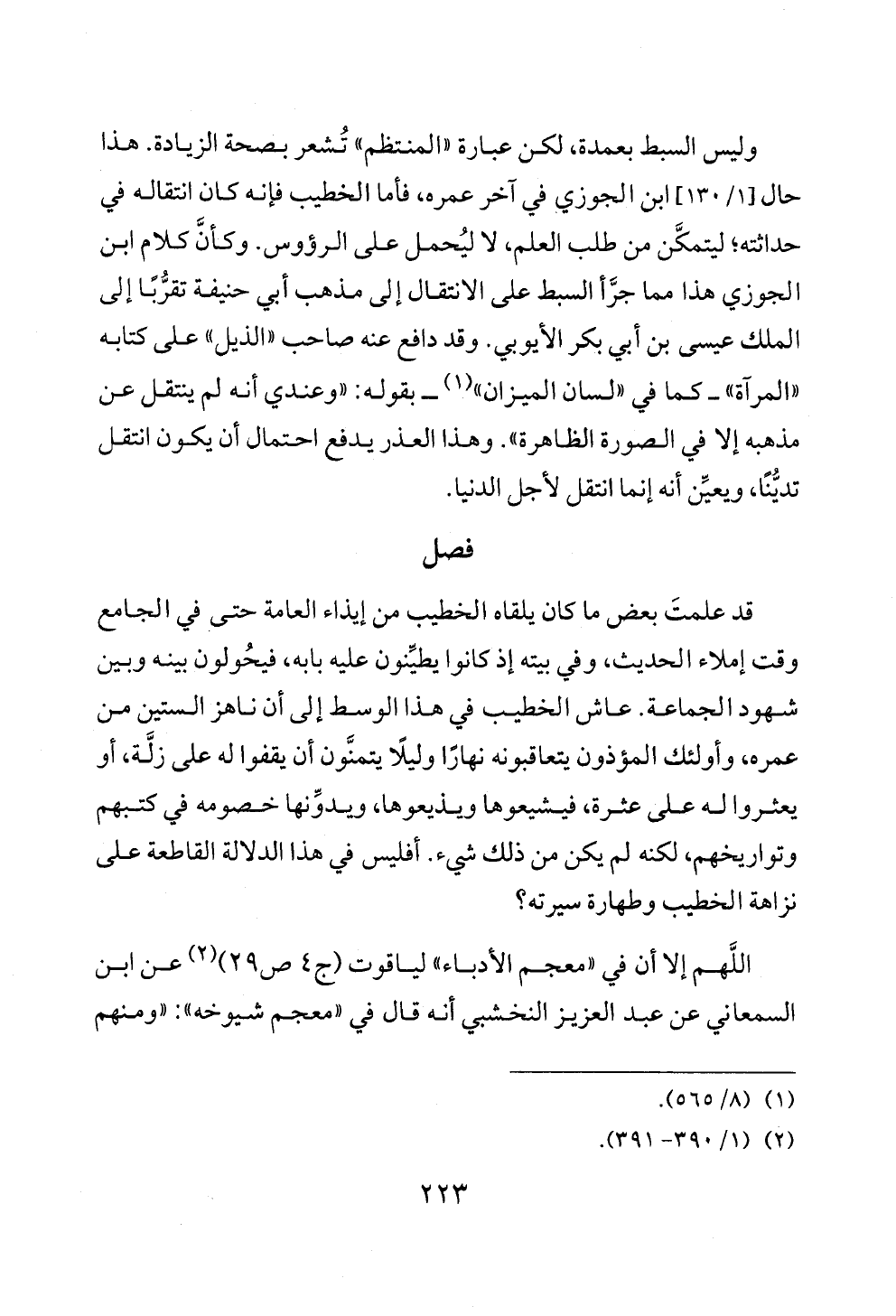 وليس السبط بعمدة، لكن عبارة «المنتظم» تُشعر بصحة الزيادة. هذا حال [١/ ١٣٠] ابن الجوزي في آخر عمره، فأما الخطيب فإنه كان انتقاله في حداثته؛ ليتمكَّن من طلب العلم، لا ليُحمل على الرؤوس. وكأنَّ كلام ابن الجوزي هذا مما جرَّأ السبط على الانتقال إلى مذهب أبي حنيفة تقرُّبًا إلى الملك عيسى بن أبي بكر الأيوبي. وقد دافع عنه صاحب «الذيل» على كتابه «المرآة» ــ كما في «لسان الميزان» (¬١) ــ بقوله: «وعندي أنه لم ينتقل عن مذهبه إلا في الصورة الظاهرة». وهذا العذر يدفع احتمال أن يكون انتقل تديُّنًا، ويعيِّن أنه إنما انتقل لأجل الدنيا.