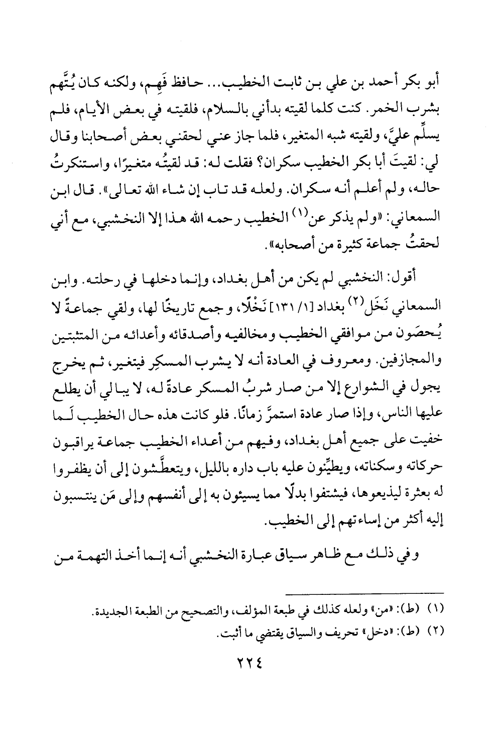 أقول: النخشبي لم يكن من أهل بغداد، وإنما دخلها في رحلته. وابن السمعاني نَخَل (¬٢) بغداد [١/ ١٣١] نَخْلًا، وجمع تاريخًا لها، ولقي جماعةً لا يُحصَون من موافقي الخطيب ومخالفيه وأصدقائه وأعدائه من المتثبتين والمجازفين. ومعروف في العادة أنه لا يشرب المسكِر فيتغير، ثم يخرج يجول في الشوارع إلا من صار شربُ المسكر عادةً له، لا يبالي أن يطلع عليها الناس، وإذا صار عادة استمرَّ زمانًا. فلو كانت هذه حال الخطيب لَما خفيت على جميع أهل بغداد، وفيهم من أعداء الخطيب جماعة يراقبون حركاته وسكناته، ويطيِّنون عليه باب داره بالليل، ويتعطَّشون إلى أن يظفروا له بعثرة ليذيعوها، فيشتفوا بدلًا مما يسيئون به إلى أنفسهم وإلى مَن ينتسبون إليه أكثر من إساءتهم إلى الخطيب.