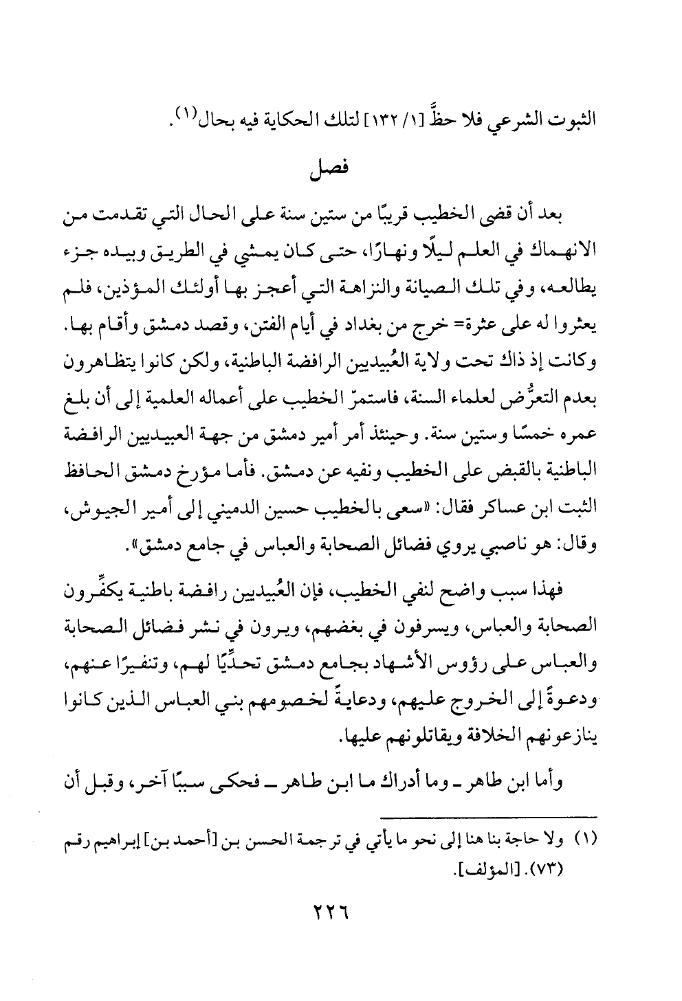 فهذا سبب واضح لنفي الخطيب، فإن العُبيديين رافضة باطنية يكفِّرون الصحابة والعباس، ويسرفون في بغضهم، ويرون في نشر فضائل الصحابة والعباس على رؤوس الأشهاد بجامع دمشق تحدِّيًا لهم، وتنفيرًا عنهم، ودعوةً إلى الخروج عليهم، ودعايةً لخصومهم بني العباس الذين كانوا ينازعونهم الخلافة ويقاتلونهم عليها.