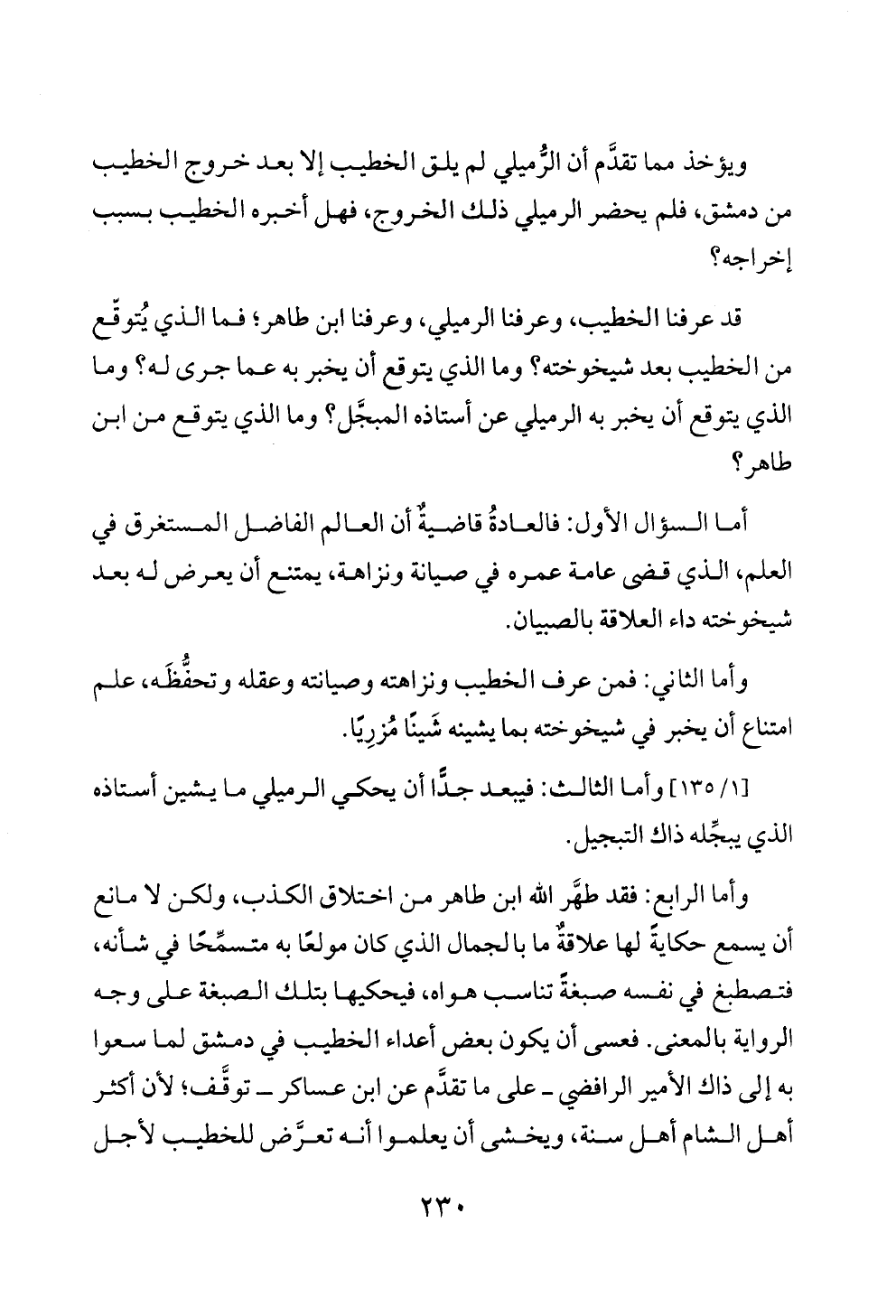 وأما الرابع: فقد طهَّر الله ابن طاهر من اختلاق الكذب، ولكن لا مانع أن يسمع حكايةً لها علاقةٌ ما بالجمال الذي كان مولعًا به متسمِّحًا في شأنه، فتصطبغ في نفسه صبغةً تناسب هواه، فيحكيها بتلك الصبغة على وجه الرواية بالمعنى. فعسى أن يكون بعض أعداء الخطيب في دمشق لما سعوا به إلى ذاك الأمير الرافضي ــ على ما تقدَّم عن ابن عساكر ــ توقَّف؛ لأن أكثر أهل الشام أهل سنة، ويخشى أن يعلموا أنه تعرَّض للخطيب لأجل