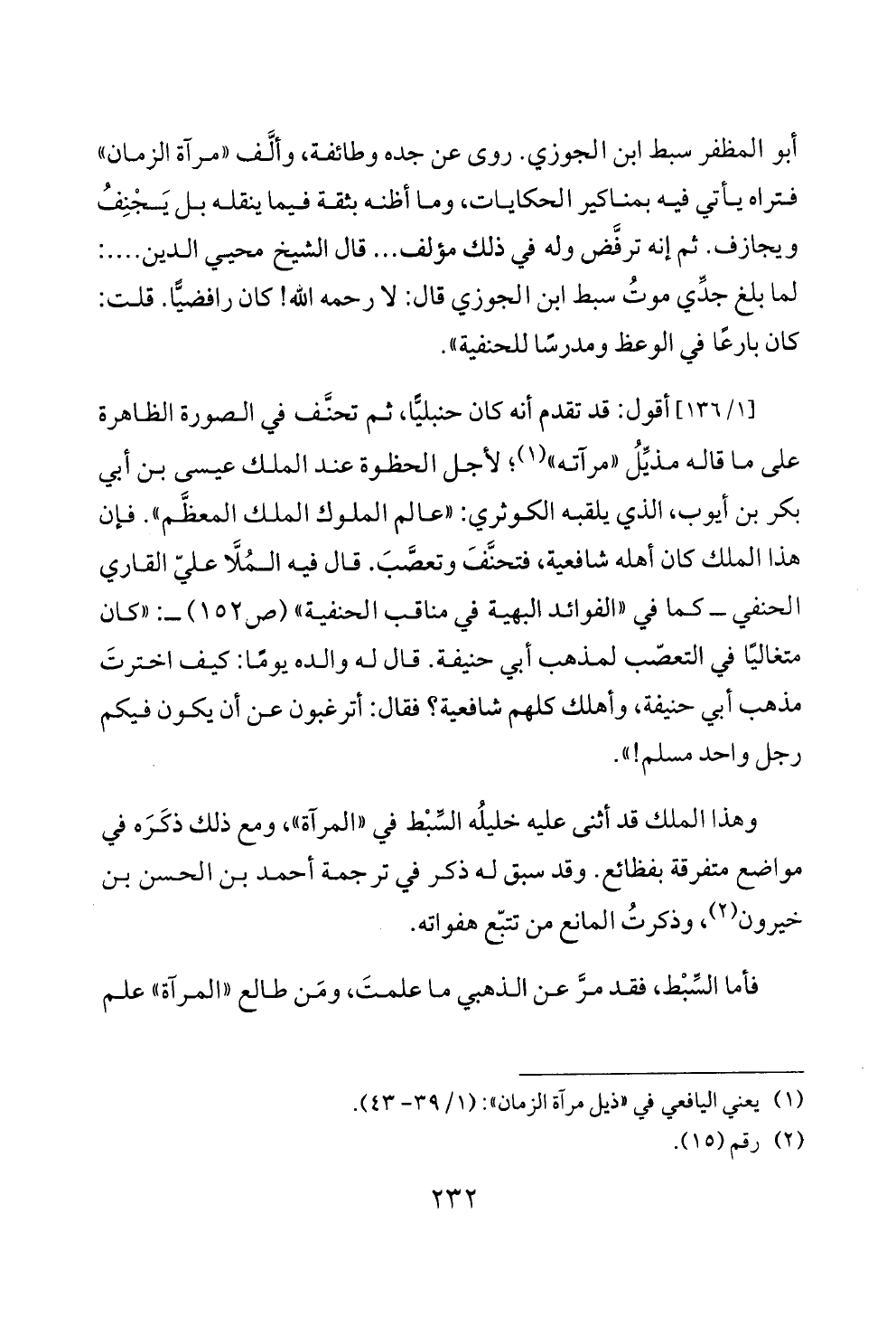 [١/ ١٣٦] أقول: قد تقدم أنه كان حنبليًّا، ثم تحنَّف في الصورة الظاهرة على ما قاله مذيِّلُ «مرآته» (¬١)؛ لأجل الحظوة عند الملك عيسى بن أبي بكر بن أيوب، الذي يلقبه الكوثري: «عالم الملوك الملك المعظَّم». فإن هذا الملك كان أهله شافعية، فتحنَّفَ وتعصَّبَ. قال فيه المُلَّا عليّ القاري الحنفي ــ كما في «الفوائد البهية في مناقب الحنفية» (ص ١٥٢) ــ: «كان متغاليًا في التعصّب لمذهب أبي حنيفة. قال له والده يومًا: كيف اخترتَ مذهب أبي حنيفة، وأهلك كلهم شافعية؟ فقال: أترغبون عن أن يكون فيكم رجل واحد مسلم! ».