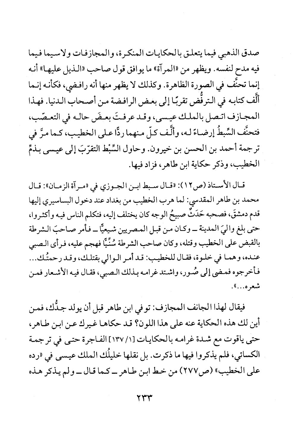 قال الأستاذ (ص ١٢): «قال سبط ابن الجوزي في «مرآة الزمان»: قال محمد بن طاهر المقدسي: لما هرب الخطيب من بغداد عند دخول البساسيري إليها قدم دمشقَ، فصحبه حَدَثٌ صبيحُ الوجه كان يختلف إليه، فتكلم الناس فيه وأكثروا، حتى بلغ واليَ المدينة ــ وكان من قبل المصريين شيعيًّا ــ فأمر صاحبَ الشرطة بالقبض على الخطيب وقتله، وكان صاحب الشرطة سُنِّيًّا فهجم عليه، فرأى الصبي عنده، وهما في خلوة، فقال للخطيب: قد أمر الوالي بقتلك، وقد رحمتُك ... فأخرجوه فمضى إلى صُور، واشتد غرامه بذلك الصبي، فقال فيه الأشعار فمن شعره ... ».