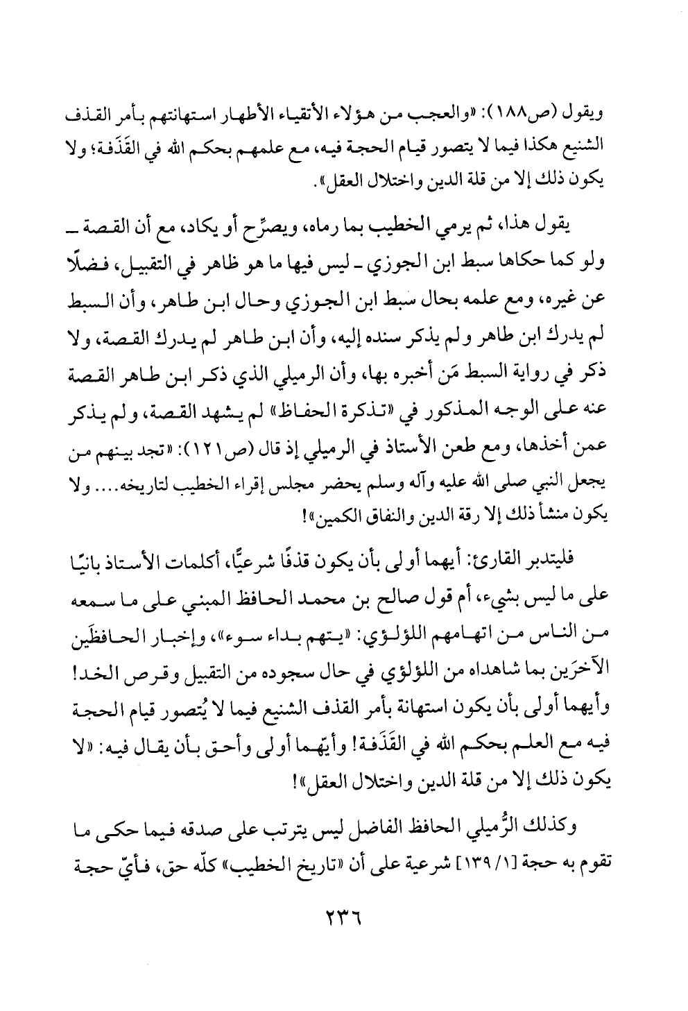 يقول هذا، ثم يرمي الخطيب بما رماه، ويصرِّح أو يكاد، مع أن القصة ــ ولو كما حكاها سبط ابن الجوزي ــ ليس فيها ما هو ظاهر في التقبيل، فضلًا عن غيره، ومع علمه بحال سبط ابن الجوزي وحال ابن طاهر، وأن السبط لم يدرك ابن طاهر ولم يذكر سنده إليه، وأن ابن طاهر لم يدرك القصة، ولا ذكر في رواية السبط مَن أخبره بها، وأن الرميلي الذي ذكر ابن طاهر القصة عنه على الوجه المذكور في «تذكرة الحفاظ» لم يشهد القصة، ولم يذكر عمن أخذها، ومع طعن الأستاذ في الرميلي إذ قال (ص ١٢١): «تجد بينهم من يجعل النبي صلى الله عليه وآله وسلم يحضر مجلس إقراء الخطيب لتاريخه .... ولا يكون منشأ ذلك إلا رقة الدين والنفاق الكمين»!