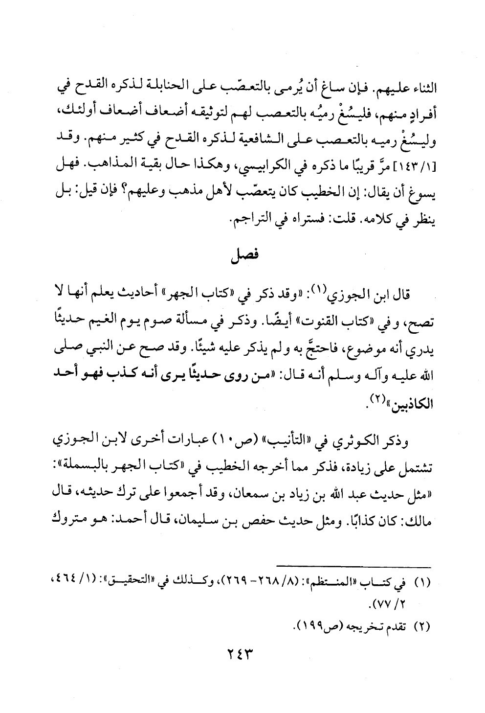 الثناء عليهم. فإن ساغ أن يُرمى بالتعصّب على الحنابلة لذكره القدح في أفرادٍ منهم، فليسُغْ رميُه بالتعصب لهم لتوثيقه أضعاف أضعاف أولئك، وليسُغْ رميه بالتعصب على الشافعية لذكره القدح في كثير منهم. وقد [١/ ١٤٣] مرَّ قريبًا ما ذكره في الكرابيسي، وهكذا حال بقية المذاهب. فهل يسوغ أن يقال: إن الخطيب كان يتعصّب لأهل مذهب وعليهم؟ فإن قيل: بل ينظر في كلامه. قلت: فستراه في التراجم.