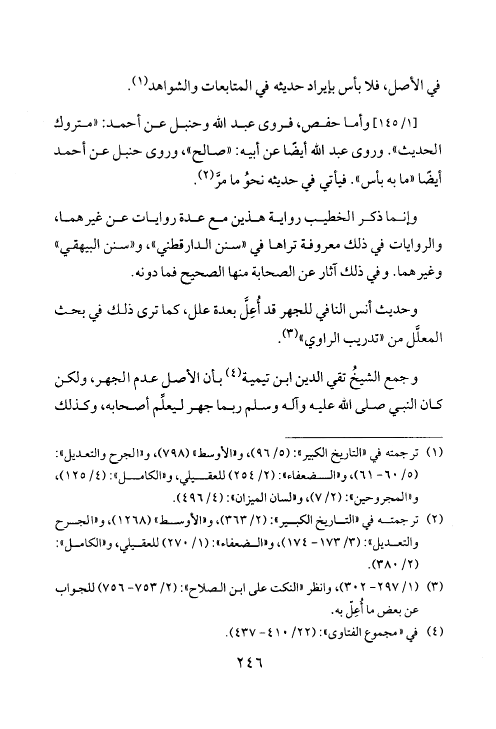 [١/ ١٤٥] وأما حفص، فروى عبد الله وحنبل عن أحمد: «متروك الحديث». وروى عبد الله أيضًا عن أبيه: «صالح»، وروى حنبل عن أحمد أيضًا «ما به بأس». فيأتي في حديثه نحوُ ما مرَّ (¬٢).