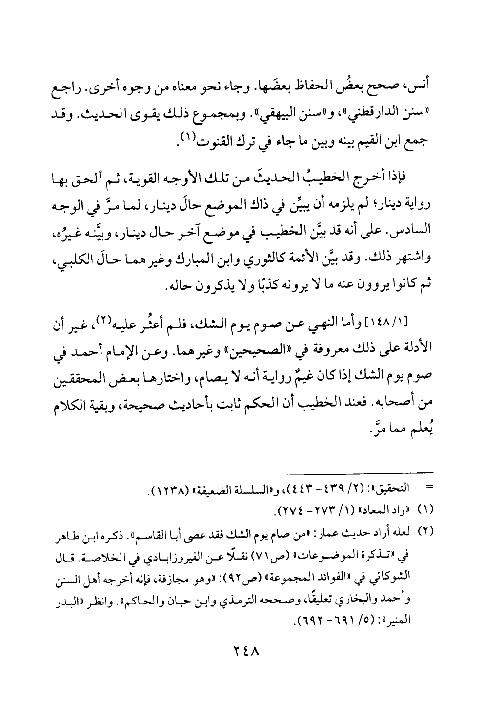[١/ ١٤٨] وأما النهي عن صوم يوم الشك، فلم أعثُر عليه (¬٢)، غير أن الأدلة على ذلك معروفة في «الصحيحين» وغيرهما. وعن الإمام أحمد في صوم يوم الشك إذا كان غيمٌ رواية أنه لا يصام، واختارها بعض المحققين من أصحابه. فعند الخطيب أن الحكم ثابت بأحاديث صحيحة، وبقية الكلام يُعلم مما مرَّ.