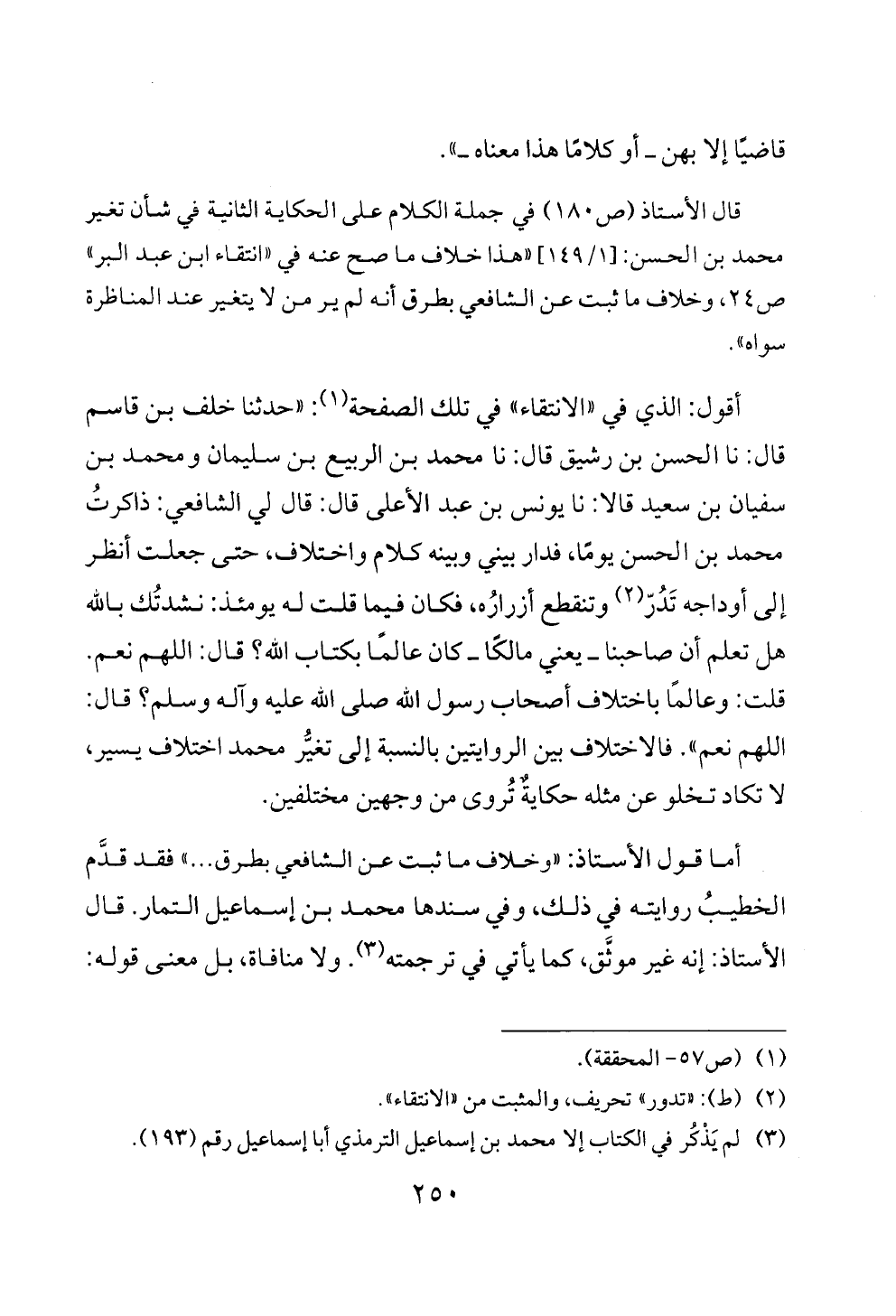 قال الأستاذ (ص ١٨٠) في جملة الكلام على الحكاية الثانية في شأن تغير محمد بن الحسن: [١/ ١٤٩] «هذا خلاف ما صح عنه في «انتقاء ابن عبد البر» ص ٢٤، وخلاف ما ثبت عن الشافعي بطرق أنه لم ير من لا يتغير عند المناظرة سواه».