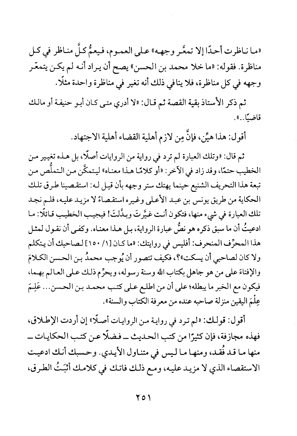ثم قال: «وتلك العبارة لم ترد في رواية من الروايات أصلًا، بل هذه تغيير من الخطيب حتمًا، وقد زاد في الآخر: «أو كلامًا هذا معناه» ليتمكَّن من التملُّص من تبعة هذا التحريف الشنيع حينما يهتك ستر وجهه بأن قيل له: استقصينا طرق تلك الحكاية من طريق يونس بن عبد الأعلى وغيره استقصاءً لا مزيد عليه، فلم نجد تلك العبارة في شيء منها، فتكون أنت غيَّرتَ وبدَّلتَ! فيجيب الخطيب قائلًا: ما ادعيتُ أن ما سبق ذكره هو نصُّ عبارة الرواية، بل هذا معناه. وكفى أن نقول لمثل هذا المحرِّف المنحرف: أفليس في روايتك: «ما كان [١/ ١٥٠] لصاحبك أن يتكلم ولا كان لصاحبي أن يسكت»؟ ، فكيف تتصور أن يُوجب محمدُ بن الحسن الكلامَ والإفتاءَ على من هو جاهل بكتاب الله وسنة رسوله، ويحرِّم ذلك على العالم بهما، فيكون مع الخبر ما يبطله؛ على أن من اطلع على كتب محمد بن الحسن ... عَلِمَ عِلْمَ اليقين منزلة صاحبه عنده من معرفة الكتاب والسنة».