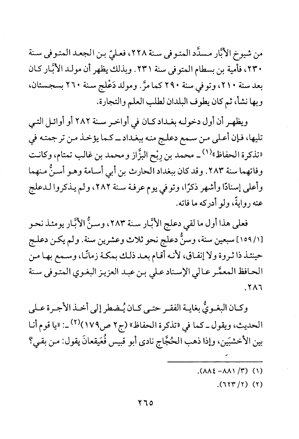 فعلى هذا أول ما لقي دعلج الأ بَّار سنة ٢٨٣، وسنُّ الأ بَّار يومئذ نحو [١/ ١٥٩] سبعين سنة، وسنُّ دعلج نحو ثلاث وعشرين سنة. ولم يكن دعلج حينئذ ذا ثروة ولا إنفاق، لأنه أقام بعد ذلك بمكة زمانًا، وسمع بها من الحافظ المعمَّر عالي الإسناد علي بن عبد العزيز البغوي المتوفى سنة ٢٨٦.