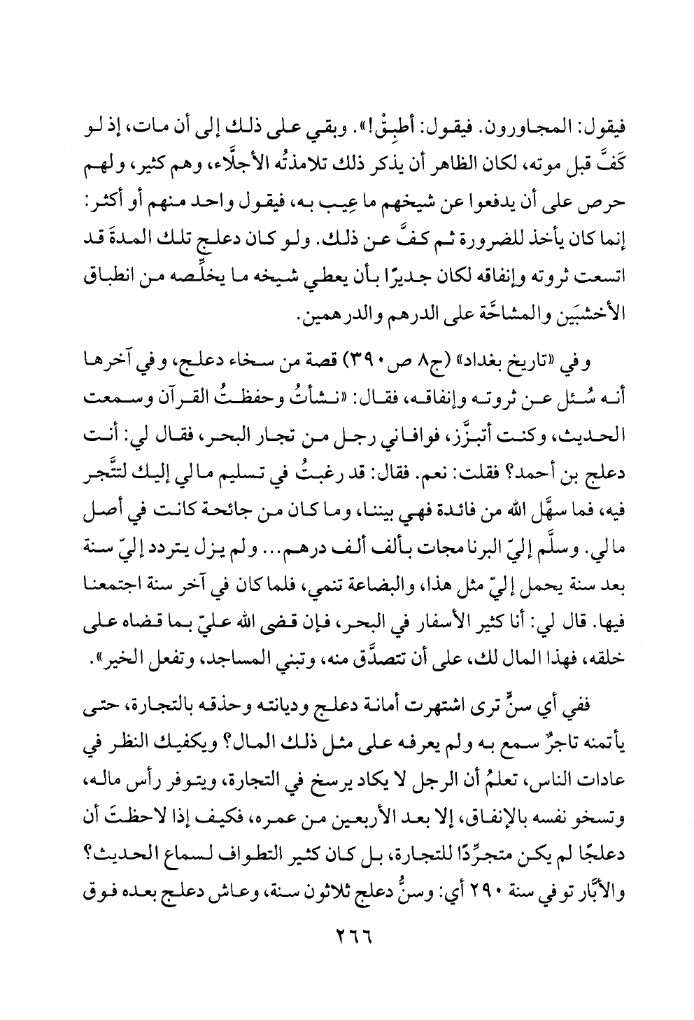 فيقول: المجاورون. فيقول: أطبِقْ! ». وبقي على ذلك إلى أن مات، إذ لو كَفَّ قبل موته، لكان الظاهر أن يذكر ذلك تلامذتُه الأجلَّاء، وهم كثير، ولهم حرص على أن يدفعوا عن شيخهم ما عِيب به، فيقول واحد منهم أو أكثر: إنما كان يأخذ للضرورة ثم كفَّ عن ذلك. ولو كان دعلج تلك المدةَ قد اتسعت ثروته وإنفاقه لكان جديرًا بأن يعطي شيخه ما يخلِّصه من انطباق الأخشبَين والمشاحَّة على الدرهم والدرهمين.