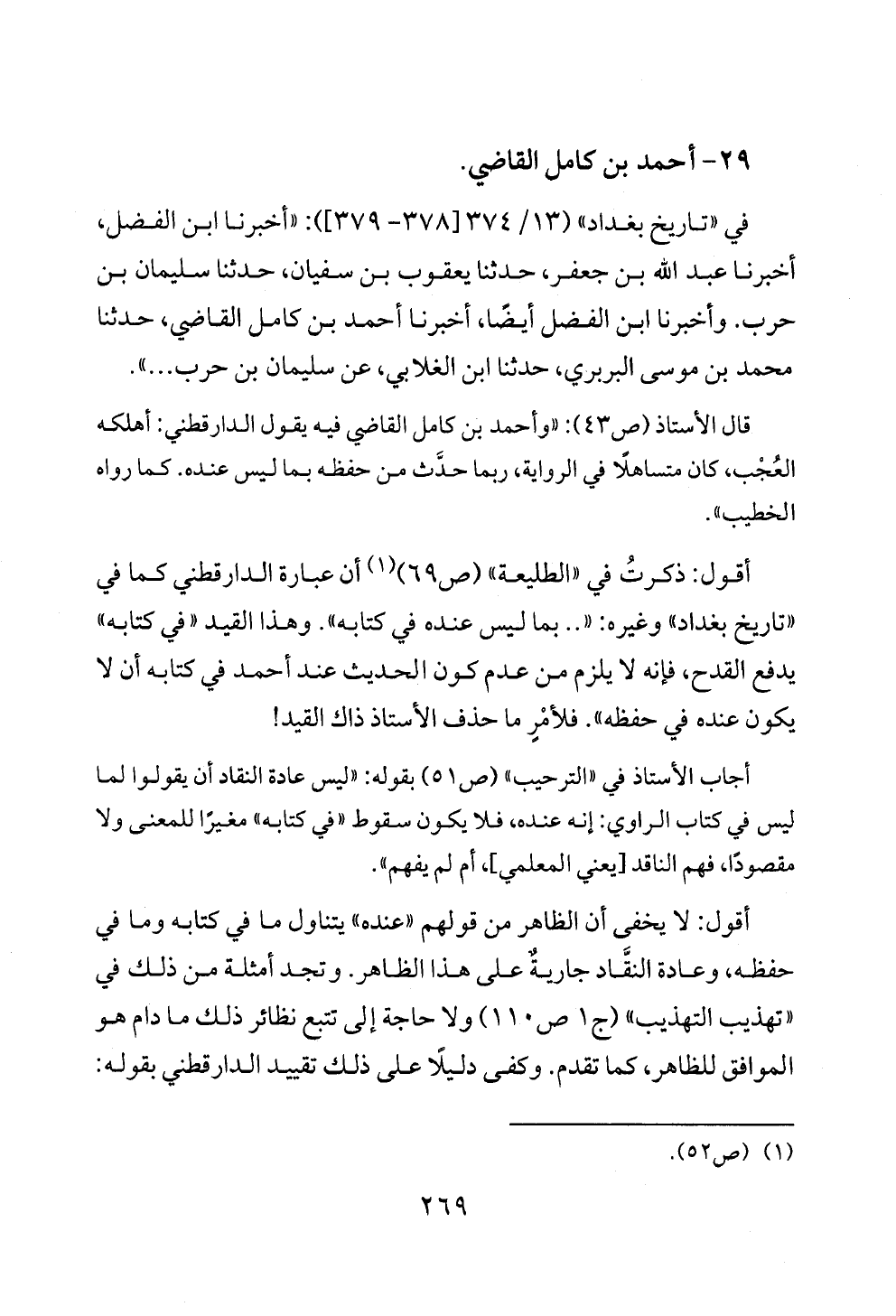 قال الأستاذ (ص ٤٣): «وأحمد بن كامل القاضي فيه يقول الدارقطني: أهلكه العُجْب، كان متساهلًا في الرواية، ربما حدَّث من حفظه بما ليس عنده. كما رواه الخطيب».