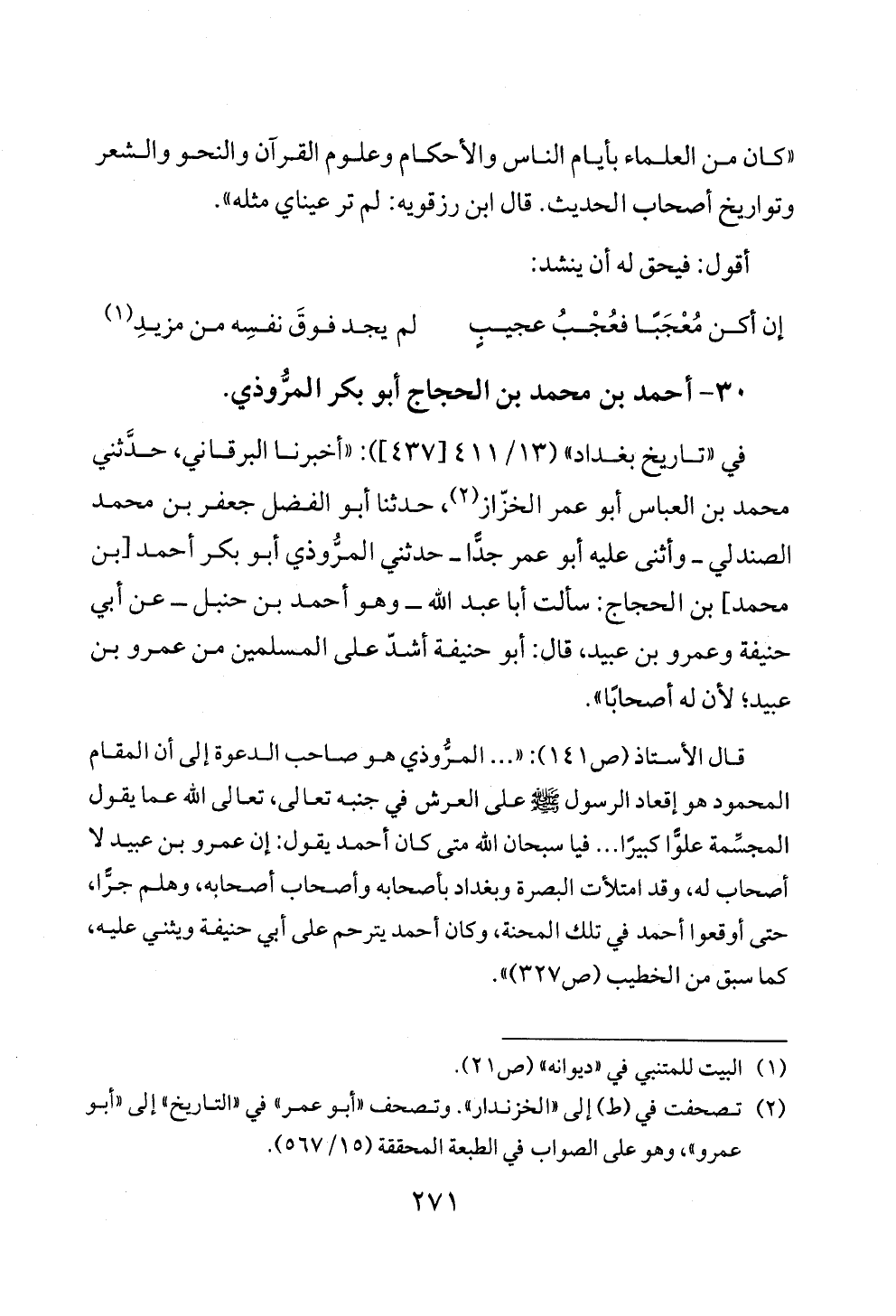 قال الأستاذ (ص ١٤١): « ... المرُّوذي هو صاحب الدعوة إلى أن المقام المحمود هو إقعاد الرسول - صلى الله عليه وسلم - على العرش في جنبه تعالى، تعالى الله عما يقول المجسِّمة علوًّا كبيرًا ... فيا سبحان الله متى كان أحمد يقول: إن عمرو بن عبيد لا أصحاب له، وقد امتلأت البصرة وبغداد بأصحابه وأصحاب أصحابه، وهلم جرًّا، حتى أوقعوا أحمد في تلك المحنة، وكان أحمد يترحم على أبي حنيفة ويثني عليه، كما سبق من الخطيب (ص ٣٢٧)».