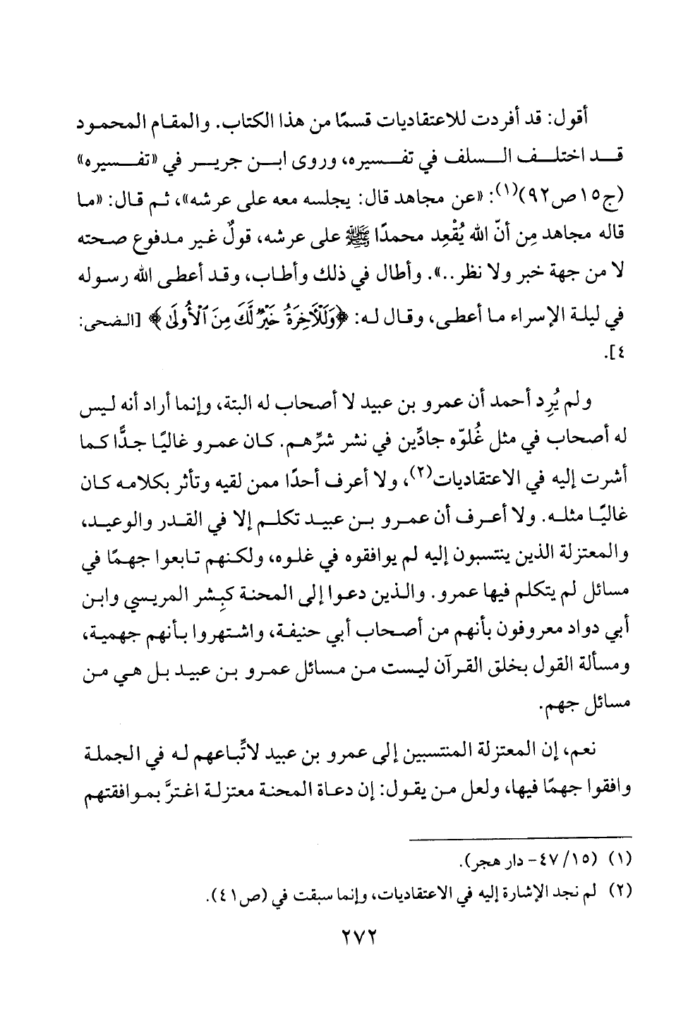 أقول: قد أفردت للاعتقاديات قسمًا من هذا الكتاب. والمقام المحمود قد اختلف السلف في تفسيره، وروى ابن جرير في «تفسيره» (ج ١٥ ص ٩٢) (¬١): «عن مجاهد قال: يجلسه معه على عرشه»، ثم قال: «ما قاله مجاهد مِن أنّ الله يُقْعِد محمدًا - صلى الله عليه وسلم - على عرشه، قولٌ غير مدفوع صحته لا من جهة خبر ولا نظر .. ». وأطال في ذلك وأطاب، وقد أعطى الله رسوله في ليلة الإسراء ما أعطى، وقال له: {وَلَلْآخِرَةُ خَيْرٌ لَكَ مِنَ الْأُولَى} [الضحى: ٤].