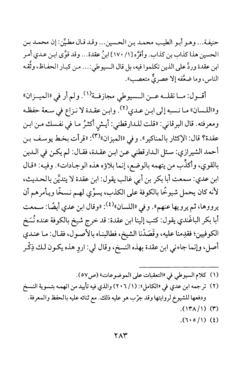أقول: ما نقله عن السيوطي مجازفة (¬١). ولم أر في «الميزان» و «اللسان» ما نسبه إلى ابن عدي (¬٢). وابن عقدة لا نزاع في سعة حفظه ومعرفته. قال البرقاني: «قلت للدارقطني: أيشٍ أكثرُ ما في نفسك من ابن عقدة؟ قال: الإكثار بالمناكير». وفي «الميزان» (¬٣): «قرأت بخط يوسف بن أحمد الشيرازي: سئل الدارقطني عن ابن عقدة، فقال: لم يكن في الدين بالقوي، وأكذِّب من يتهمه بالوضع، إنما بلاؤه هذه الوجادات». وفيه: «قال ابن عدي: سمعت أبا بكر بن أبي غالب يقول: ابن عقدة لا يتديَّن بالحديث، لأنه كان يحمل شيوخًا بالكوفة على الكذب، يسوِّي لهم نسخًا ويأمرهم أن يرووها، ثم يرويها عنهم». وفي «اللسان» (¬٤): «وقال ابن عدي أيضًا: سمعت أبا بكر الباغَندي يقول: كتب إلينا ابن عقدة: قد خرج شيخ بالكوفة عنده نُسَخ الكوفيين؛ فقدِمنا عليه، وقَصَدْنا الشيخ، فطالبناه بالأصول، فقال: ما عندي أصل، وإنما جاءني ابن عقدة بهذه النسخ، وقال لي: اروِ هذه يكون لك ذِكْر