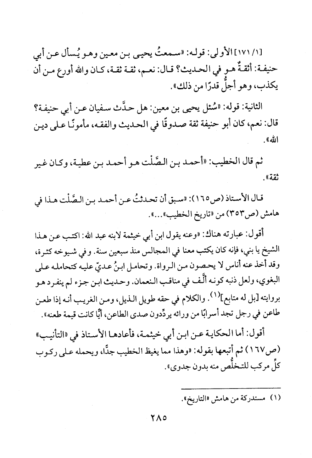 [١/ ١٧١] الأولى: قوله: «سمعتُ يحيى بن معين وهو يُسأل عن أبي حنيفة: أثقةٌ هو في الحديث؟ قال: نعم، ثقة ثقة، كان والله أورع من أن يكذب، وهو أجلُّ قدرًا من ذلك».
