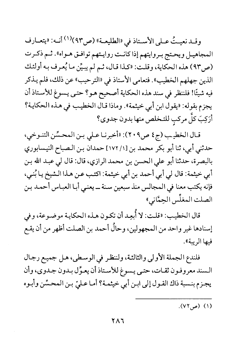 وقد نعيتُ على الأستاذ في «الطليعة» (ص ٩٣) (¬١) أنه: «يتعارف المجاهيل ويحتج بروايتهم إذا كانت روايتهم توافق هواه». ثم ذكرت (ص ٩٣) هذه الحكاية، وقلت: «كذا قال، ثم لم يبيِّن ما يُعرف به أولئك الذين جهلهم الخطيب». فتعامى الأستاذ في «الترحيب» عن ذلك، فلم يذكر فيه شيئًا! فلننظر في سند هذه الحكاية أصحيح هو؟ حتى يسوغ للأستاذ أن يجزم بقوله: «يقول ابن أبي خيثمة». وماذا قال الخطيب في هذه الحكاية؟ أرَكِبَ كلَّ مركبٍ للتخلص منها بدون جدوى؟