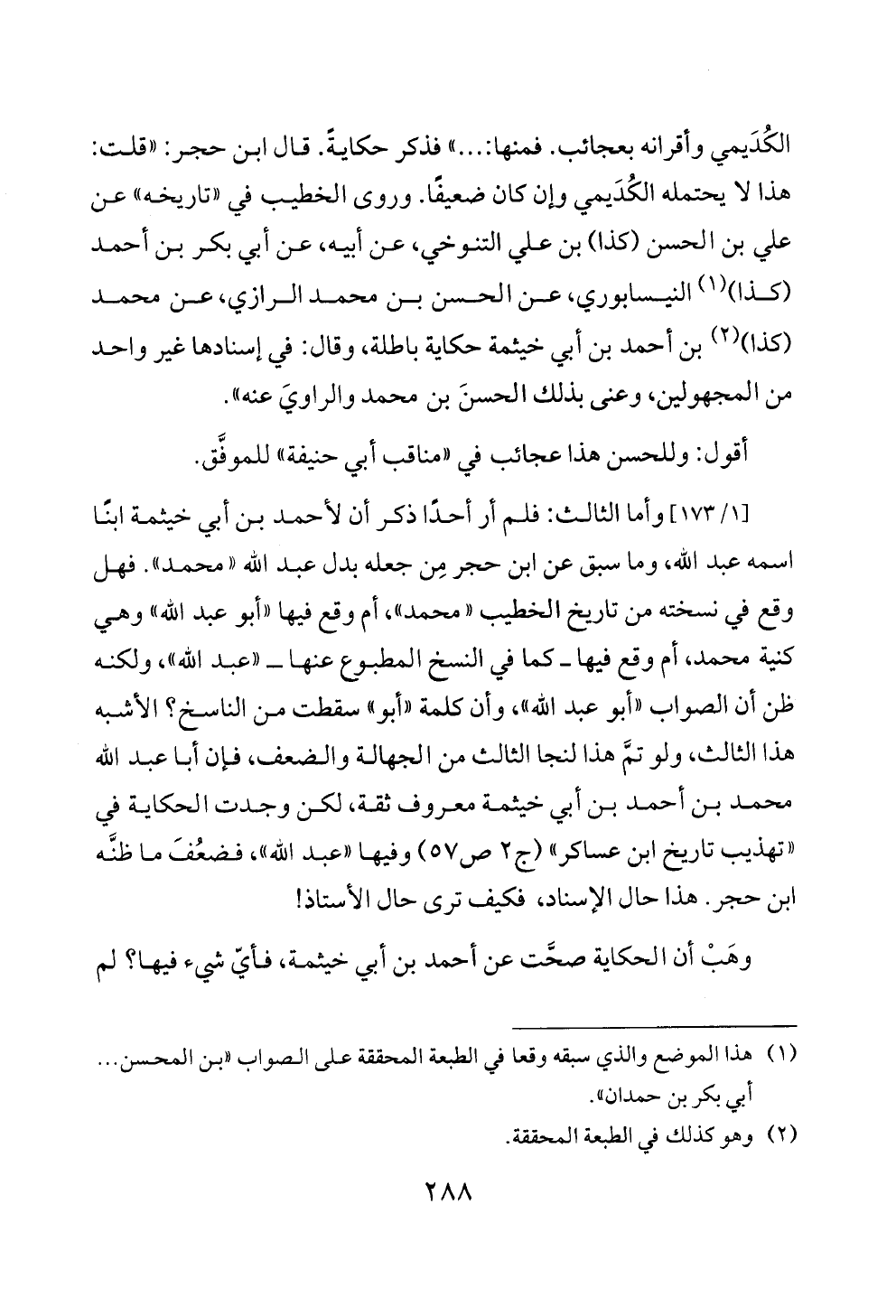 [١/ ١٧٣] وأما الثالث: فلم أر أحدًا ذكر أن لأحمد بن أبي خيثمة ابنًا اسمه عبد الله، وما سبق عن ابن حجر مِن جعله بدل عبد الله «محمد». فهل وقع في نسخته من تاريخ الخطيب «محمد»، أم وقع فيها «أبو عبد الله» وهي كنية محمد، أم وقع فيها ــ كما في النسخ المطبوع عنها ــ «عبد الله»، ولكنه ظن أن الصواب «أبو عبد الله»، وأن كلمة «أبو» سقطت من الناسخ؟ الأشبه هذا الثالث، ولو تمَّ هذا لنجا الثالث من الجهالة والضعف، فإن أبا عبد الله محمد بن أحمد بن أبي خيثمة معروف ثقة، لكن وجدت الحكاية في «تهذيب تاريخ ابن عساكر» (ج ٢ ص ٥٧) وفيها «عبد الله»، فضعُفَ ما ظنَّه ابن حجر. هذا حال الإسناد, فكيف ترى حال الأستاذ!