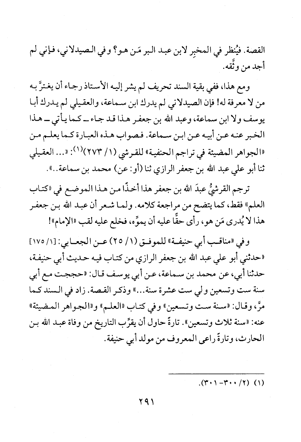 ومع هذا، ففي بقية السند تحريف لم يشر إليه الأستاذ رجاء أن يغترَّ به من لا معرفة له! فإن الصيدلاني لم يدرك ابن سماعة، والعقيلي لم يدرك أبا يوسف ولا ابن سماعة، وعبد الله بن جعفر هذا قد جاء ــ كما يأتي ــ هذا الخبر عنه عن أبيه عن ابن سماعة. فصواب هذه العبارة كما يعلم من «الجواهر المضيئة في تراجم الحنفية» للقرشي (١/ ٢٧٣) (¬١): « ... العقيلي ثنا أبو علي عبد الله بن جعفر الرازي ثنا (أو: عن) محمد بن سماعة .. ».