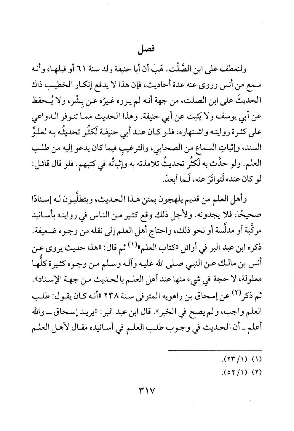 ولنعطف على ابن الصَّلْت. هَبْ أن أبا حنيفة ولد سنة ٦١ أو قبلها، وأنه سمع من أنس وروى عنه عدة أحاديث، فإن هذا لا يدفع إنكار الخطيب ذاك الحديثَ على ابن الصلت، من جهة أنه لم يروه غيرُه عن بِشْر، ولا يُحفظ عن أبي يوسف ولا يَثبت عن أبي حنيفة. وهذا الحديث مما تتوفر الدواعي على كثرة روايته واشتهاره، فلو كان عند أبي حنيفة لَكثُر تحديثُه به لعلوِّ السند، وإثباتِ السماع من الصحابي، والترغيبِ فيما كان يدعو إليه من طلب العلم. ولو حدَّث به لَكثُر تحديثُ تلامذته به وإثباتُه في كتبهم. فلو قال قائل: لو كان عنده لَتواتَرَ عنه، لَما أبعدَ.