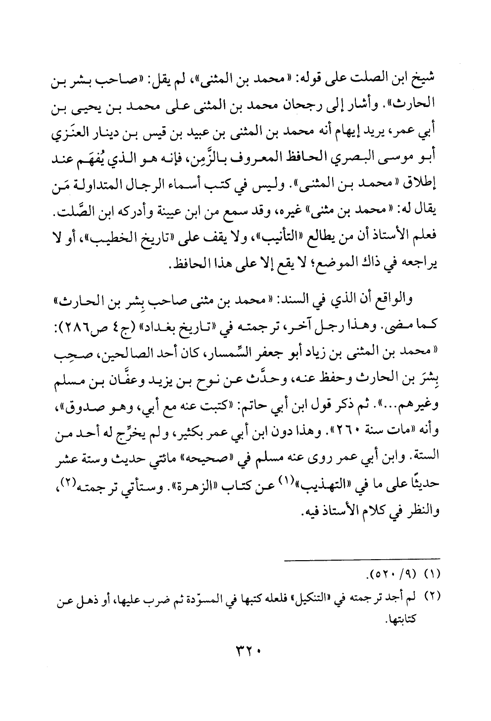 شيخ ابن الصلت على قوله: «محمد بن المثنى»، لم يقل: «صاحب بشر بن الحارث». وأشار إلى رجحان محمد بن المثنى على محمد بن يحيى بن أبي عمر، يريد إيهام أنه محمد بن المثنى بن عبيد بن قيس بن دينار العنَزي أبو موسى البصري الحافظ المعروف بالزَّمِن، فإنه هو الذي يُفهَم عند إطلاق «محمد بن المثنى». وليس في كتب أسماء الرجال المتداولة مَن يقال له: «محمد بن مثنى» غيره، وقد سمع من ابن عيينة وأدركه ابن الصَّلت. فعلم الأستاذ أن من يطالع «التأنيب»، ولا يقف على «تاريخ الخطيب»، أو لا يراجعه في ذاك الموضع؛ لا يقع إلا على هذا الحافظ.