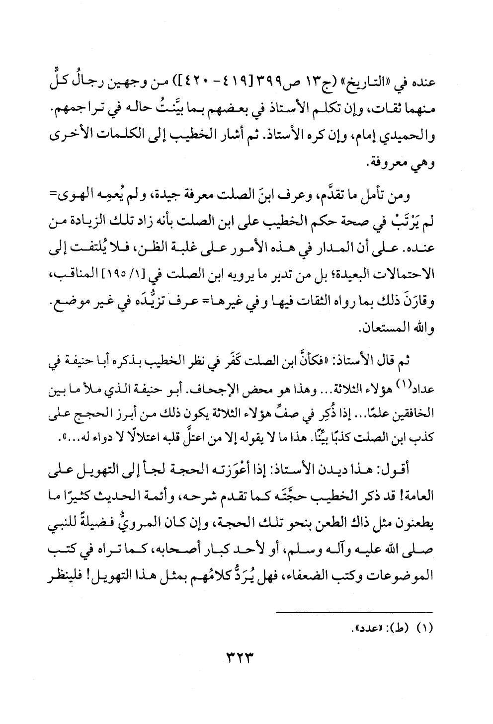 ثم قال الأستاذ: «فكأنَّ ابن الصلت كَفَر في نظر الخطيب بذكره أبا حنيفة في عداد (¬١) هؤلاء الثلاثة ... وهذا هو محض الإجحاف. أبو حنيفة الذي ملأ ما بين الخافقين علمًا ... إذا ذُكِر في صفِّ هؤلاء الثلاثة يكون ذلك من أبرز الحجج على كذب ابن الصلت كذبًا بيِّنًا. هذا ما لا يقوله إلا من اعتلَّ قلبه اعتلالًا لا دواء له ... ».