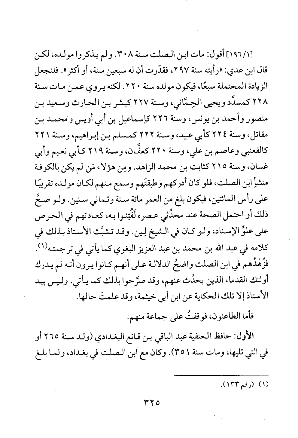 [١/ ١٩٦] أقول: مات ابن الصلت سنة ٣٠٨. ولم يذكروا مولده، لكن قال ابن عدي: «رأيته سنة ٢٩٧، فقدّرت أن له سبعين سنة، أو أكثر». فلنجعل الزيادة المحتملة سبعًا، فيكون مولده سنة ٢٢٠. لكنه يروي عمن مات سنة ٢٢٨ كمسدَّد ويحيى الحِمَّاني، وسنة ٢٢٧ كبشر بن الحارث وسعيد بن منصور وأحمد بن يونس، وسنة ٢٢٦ كإسماعيل بن أبي أويس ومحمد بن مقاتل، وسنة ٢٢٤ كأبي عبيد، وسنة ٢٢٢ كمسلم بن إبراهيم، وسنة ٢٢١ كالقعنبي وعاصم بن علي، وسنة ٢٢٠ كعفَّان، وسنة ٢١٩ كأبي نعيم وأبي غسان، وسنة ٢١٥ كثابت بن محمد الزاهد. ومِن هؤلاء مَن لم يكن بالكوفة منشأِ ابن الصلت، فلو كان أدركهم وطبقتَهم وسمع منهم لكان مولده تقريبًا على رأس المائتين، فيكون بلغ من العمر مائة سنة وثماني سنين. ولو صحَّ ذلك أو احتمل الصحة عند محدِّثي عصره لَفُتِنوا به، كعادتهم في الحرص على علوِّ الإسناد، ولو كان في الشيخ لِين. وقد تشبَّث الأستاذ بذلك في كلامه في عبد الله بن محمد بن عبد العزيز البغوي كما يأتي في ترجمته (¬١). فزُهْدُهم في ابن الصلت واضحُ الدلالة على أنهم كانوا يرون أنه لم يدرك أولئك القدماء الذين يحدِّث عنهم، وقد صرَّحوا بذلك كما يأتي. وليس بيد الأستاذ إلا تلك الحكاية عن ابن أبي خيثمة، وقد علمتَ حالها.