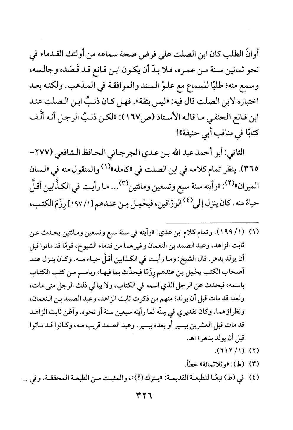 أوانَ الطلب كان ابن الصلت على فرض صحة سماعه من أولئك القدماء في نحو ثمانين سنة من عمره، فلا بدّ أن يكون ابن قانع قد قَصَده وجالسه، وسمع منه؛ طلبًا للسماع مع علوّ السند والموافقة في المذهب. ولكنه بعد اختباره لابن الصلت قال فيه: «ليس بثقة». فهل كان ذنبُ ابن الصلت عند ابن قانع الحنفي ما قاله الأستاذ (ص ١٦٧): «لكن ذنبُ الرجل أنه ألَّف كتابًا في مناقب أبي حنيفة»!