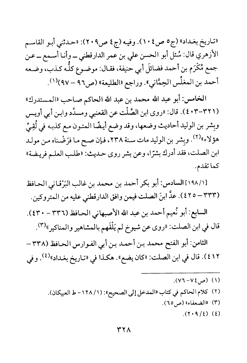 الخامس: أبو عبد الله محمد بن عبد الله الحاكم صاحب «المستدرك» (٣٢١ - ٤٠٣). قال: «روى ابن الصَّلْت عن القعنبي ومسدَّد وابن أبي أويس وبِشر بن الوليد أحاديث وضعها، وقد وضع أيضًا المتون مع كذبه في لُقِيِّ هؤلاء» (¬٢). وبِشر بن الوليد مات سنة ٢٣٨، فإن صح ما فرَضْناه من مولد ابن الصلت، فقد أدرك بشرًا، وعن بشر روى حديث: «طلب العلم فريضة» كما تقدم.