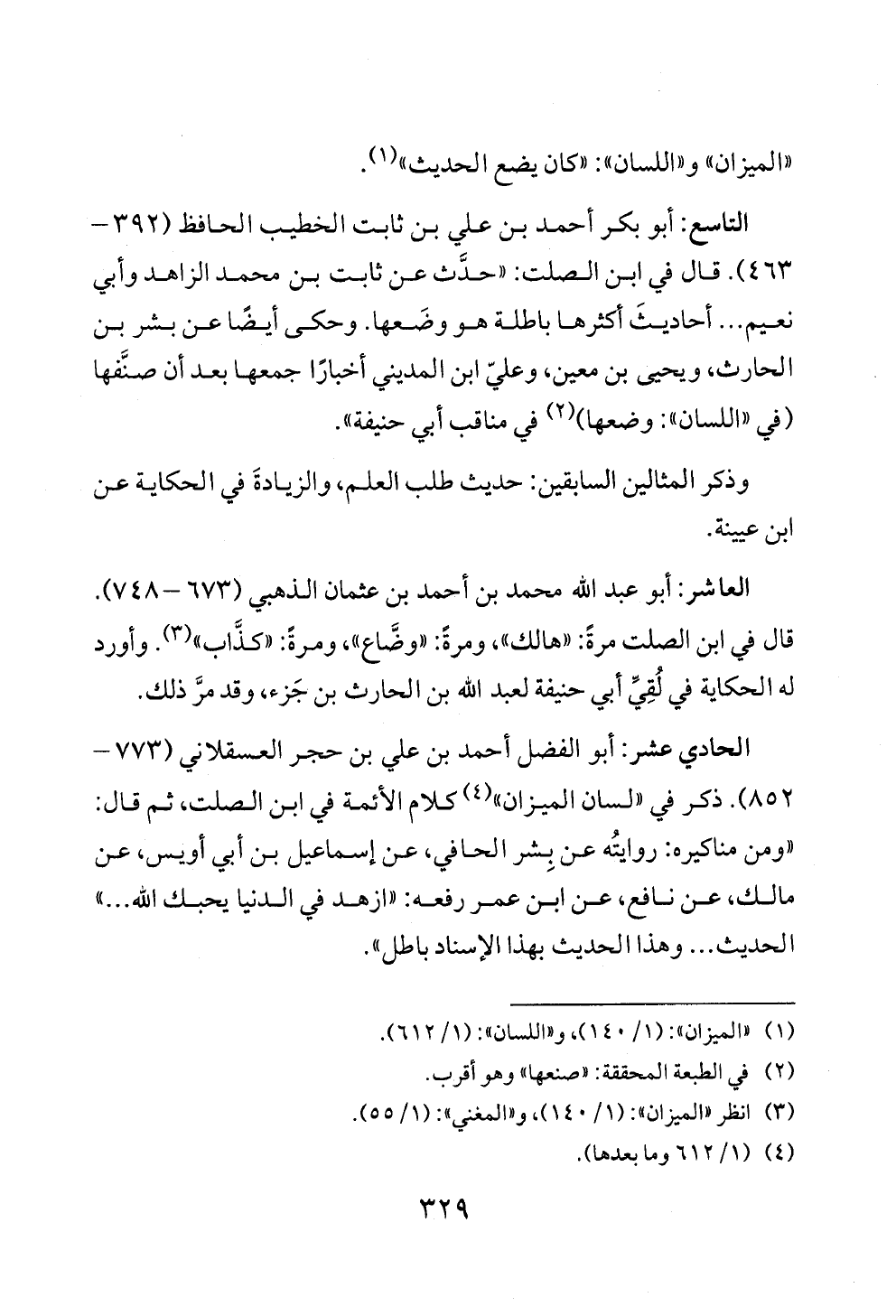 التاسع: أبو بكر أحمد بن علي بن ثابت الخطيب الحافظ (٣٩٢ - ٤٦٣). قال في ابن الصلت: «حدَّث عن ثابت بن محمد الزاهد وأبي نعيم ... أحاديثَ أكثرها باطلة هو وضَعها. وحكى أيضًا عن بشر بن الحارث، ويحيى بن معين، وعليّ ابن المديني أخبارًا جمعها بعد أن صنَّفها (في «اللسان»: وضعها) (¬٢) في مناقب أبي حنيفة».
