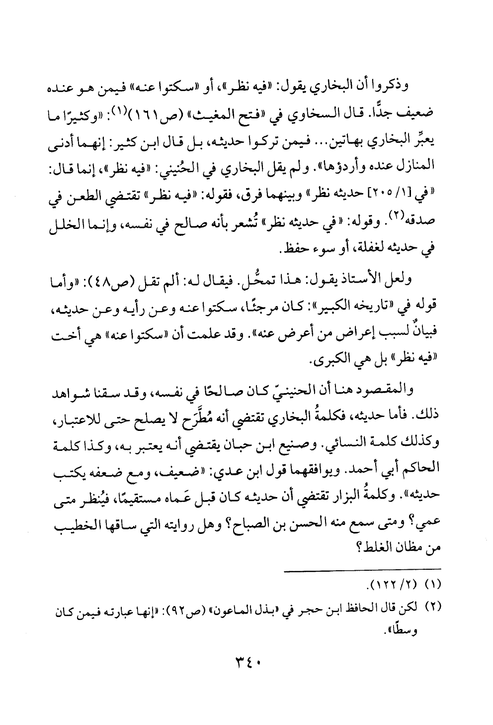وذكروا أن البخاري يقول: «فيه نظر»، أو «سكتوا عنه» فيمن هو عنده ضعيف جدًّا. قال السخاوي في «فتح المغيث» (ص ١٦١) (¬١): «وكثيرًا ما يعبِّر البخاري بهاتين ... فيمن تركوا حديثه، بل قال ابن كثير: إنهما أدنى المنازل عنده وأردؤها». ولم يقل البخاري في الحُنيني: «فيه نظر»، إنما قال: «في [١/ ٢٠٥] حديثه نظر» وبينهما فرق، فقوله: «فيه نظر» تقتضي الطعن في صدقه (¬٢). وقوله: «في حديثه نظر» تُشعر بأنه صالح في نفسه، وإنما الخلل في حديثه لغفلة، أو سوء حفظ.