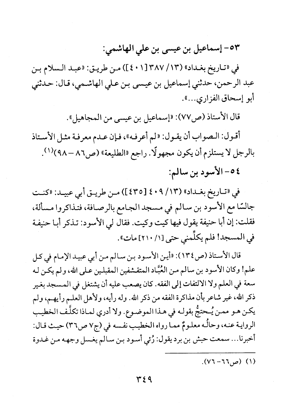قال الأستاذ (ص ١٣٤): «أين الأسود بن سالم من أبي عبيد الإمام في كل علم! وكان الأسود بن سالم من العُبَّاد المتقشفين المقبلين على الله، ولم يكن له سعة في العلم ولا الالتفات إلى الفقه. كان يصعب عليه أن يشتغل في المسجد بغير ذكر الله، غير شاعر بأن مذاكرة الفقه من ذكر الله. وله رأيه، ولأهل العلم رأيهم، ولم يكن هو ممن يُحتجُّ بقوله في هذا الموضوع. ولا أدري لماذا تكلَّف الخطيب الرواية عنه، وحالُه معلومٌ مما رواه الخطيب نفسه في (ج ٧ ص ٣٦) حيث قال: أخبرنا ... سمعت حبش بن برد يقول: رُئي أسود بن سالم يغسل وجهه من غدوة