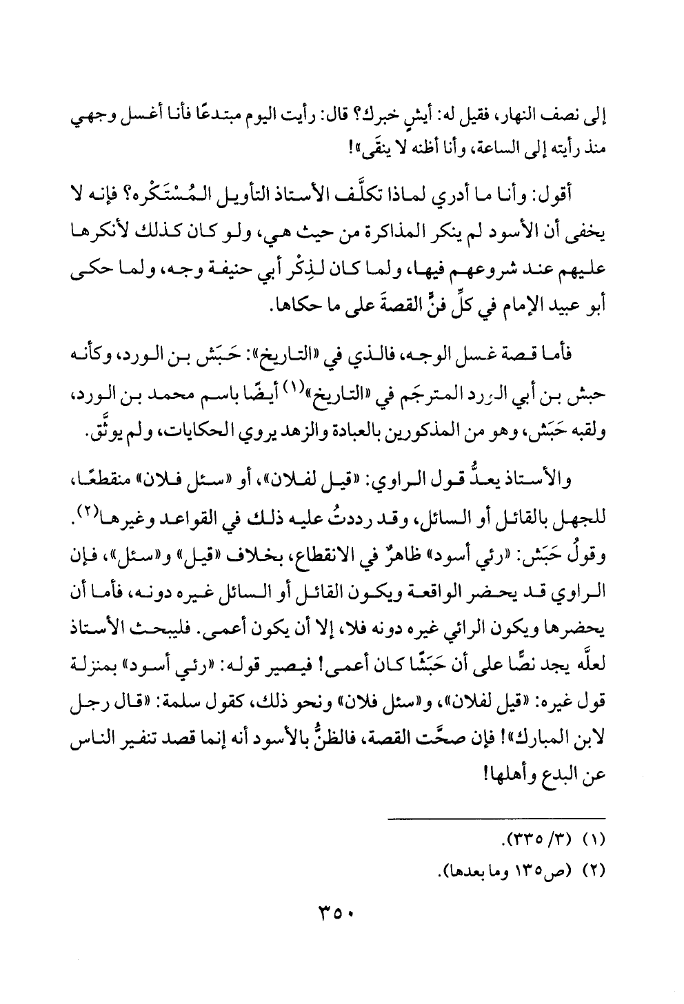 والأستاذ يعدُّ قول الراوي: «قيل لفلان»، أو «سئل فلان» منقطعًا، للجهل بالقائل أو السائل، وقد رددتُ عليه ذلك في القواعد وغيرها (¬٢). وقولُ حَبَش: «رئي أسود» ظاهرٌ في الانقطاع، بخلاف «قيل» و «سئل»، فإن الراوي قد يحضر الواقعة ويكون القائل أو السائل غيره دونه، فأما أن يحضرها ويكون الرائي غيره دونه فلا، إلا أن يكون أعمى. فليبحث الأستاذ لعلَّه يجد نصًّا على أن حَبَشًا كان أعمى! فيصير قوله: «رئي أسود» بمنزلة قول غيره: «قيل لفلان»، و «سئل فلان» ونحو ذلك، كقول سلمة: «قال رجل لابن المبارك»! فإن صحَّت القصة، فالظنُّ بالأسود أنه إنما قصد تنفير الناس عن البدع وأهلها!