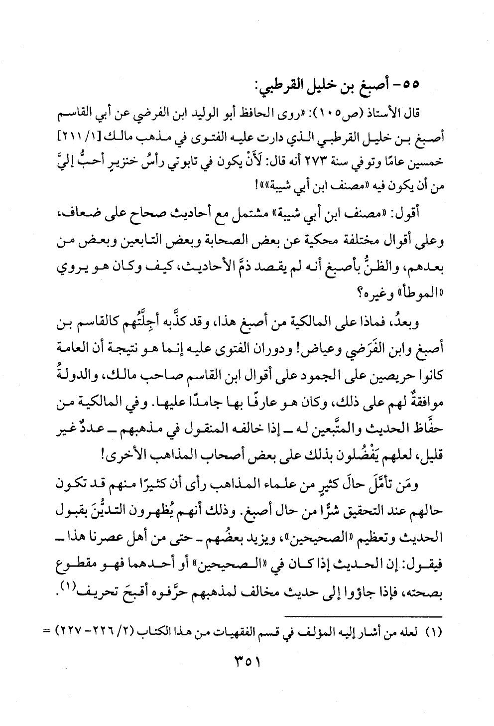 قال الأستاذ (ص ١٠٥): «روى الحافظ أبو الوليد ابن الفرضي عن أبي القاسم أصبغ بن خليل القرطبي الذي دارت عليه الفتوى في مذهب مالك [١/ ٢١١] خمسين عامًا وتوفي سنة ٢٧٣ أنه قال: لَأَنْ يكون في تابوتي رأسُ خنزيرٍ أحبُّ إليَّ من أن يكون فيه «مصنف ابن أبي شيبة»»!