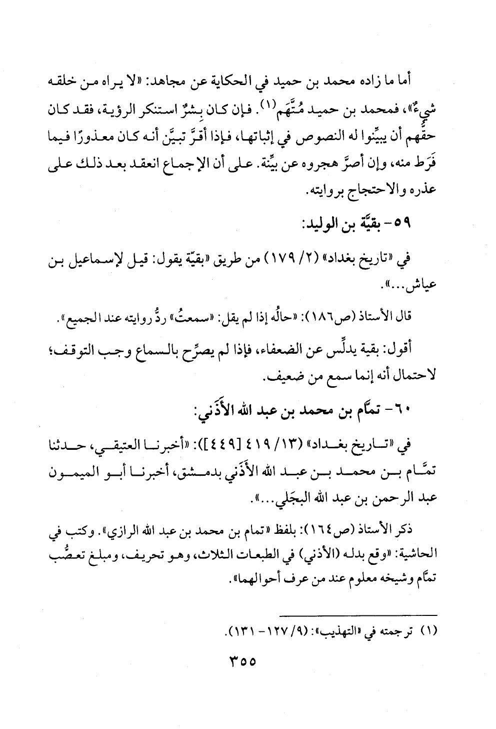 ذكر الأستاذ (ص ١٦٤): بلفظ «تمام بن محمد بن عبد الله الرازي». وكتب في الحاشية: «وقع بدله (الأذني) في الطبعات الثلاث، وهو تحريف، ومبلغ تعصُّب تمَّام وشيخه معلوم عند من عرف أحوالهما».