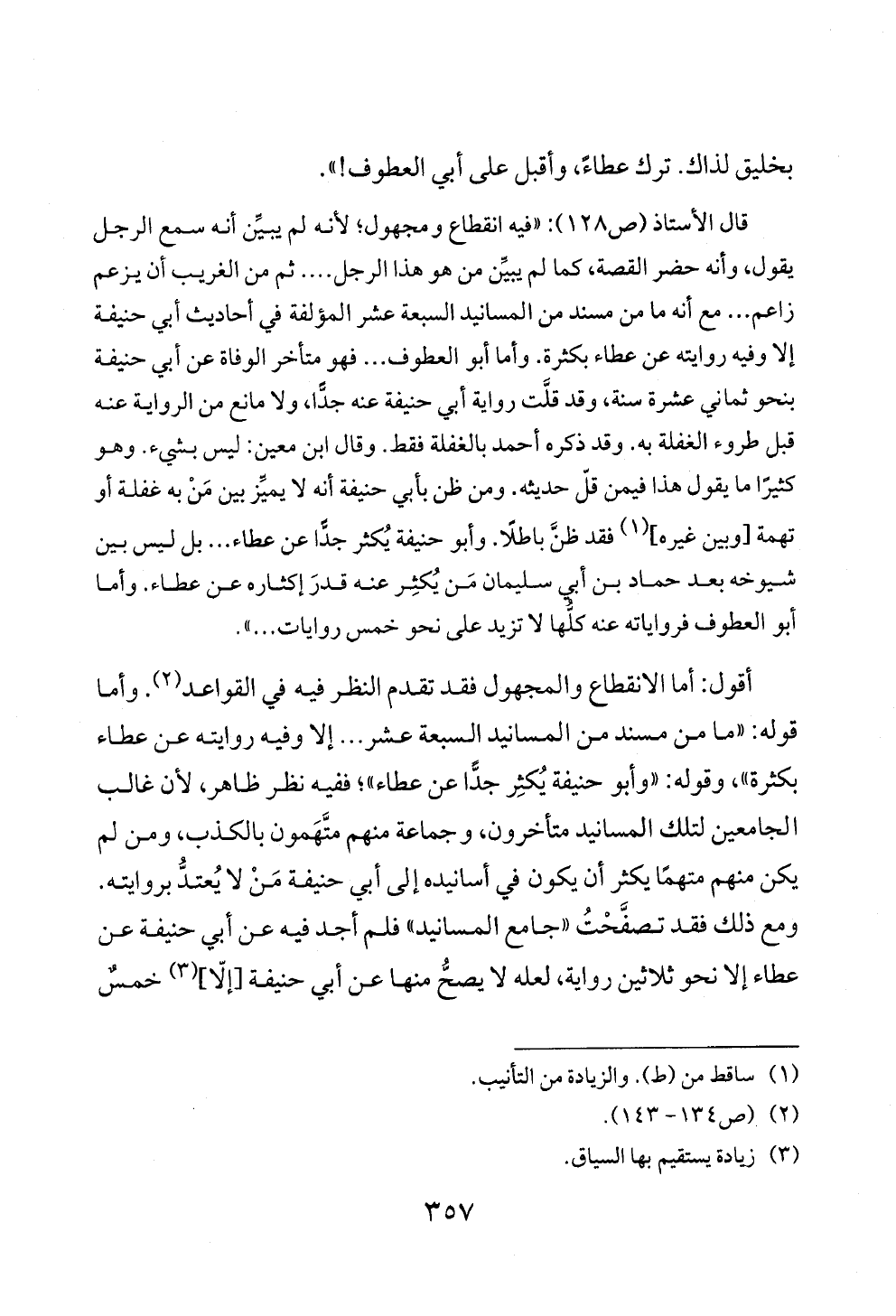 قال الأستاذ (ص ١٢٨): «فيه انقطاع ومجهول؛ لأنه لم يبيِّن أنه سمع الرجل يقول، وأنه حضر القصة، كما لم يبيِّن من هو هذا الرجل .... ثم من الغريب أن يزعم زاعم ... مع أنه ما من مسند من المسانيد السبعة عشر المؤلفة في أحاديث أبي حنيفة إلا وفيه روايته عن عطاء بكثرة. وأما أبو العطوف ... فهو متأخر الوفاة عن أبي حنيفة بنحو ثماني عشرة سنة، وقد قلَّت رواية أبي حنيفة عنه جدًّا، ولا مانع من الرواية عنه قبل طروء الغفلة به. وقد ذكره أحمد بالغفلة فقط. وقال ابن معين: ليس بشيء. وهو كثيرًا ما يقول هذا فيمن قلّ حديثه. ومن ظن بأبي حنيفة أنه لا يميِّز بين مَنْ به غفلة أو تهمة [وبين غيره] (¬١) فقد ظنَّ باطلًا. وأبو حنيفة يُكثر جدًّا عن عطاء ... بل ليس بين شيوخه بعد حماد بن أبي سليمان مَن يُكثِر عنه قدرَ إكثاره عن عطاء. وأما أبو العطوف فرواياته عنه كلُّها لا تزيد على نحو خمس روايات ... ».