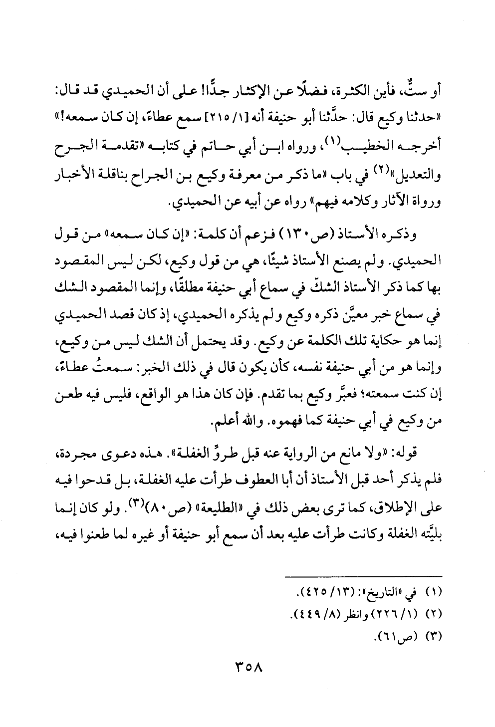 وذكره الأستاذ (ص ١٣٠) فزعم أن كلمة: «إن كان سمعه» من قول الحميدي. ولم يصنع الأستاذ شيئًا، هي من قول وكيع، لكن ليس المقصود بها كما ذكر الأستاذ الشكّ في سماع أبي حنيفة مطلقًا، وإنما المقصود الشك في سماع خبر معيَّن ذكره وكيع ولم يذكره الحميدي، إذ كان قصد الحميدي إنما هو حكاية تلك الكلمة عن وكيع. وقد يحتمل أن الشك ليس من وكيع، وإنما هو من أبي حنيفة نفسه، كأن يكون قال في ذلك الخبر: سمعتُ عطاءً، إن كنت سمعته؛ فعبَّر وكيع بما تقدم. فإن كان هذا هو الواقع، فليس فيه طعن من وكيع في أبي حنيفة كما فهموه. والله أعلم.